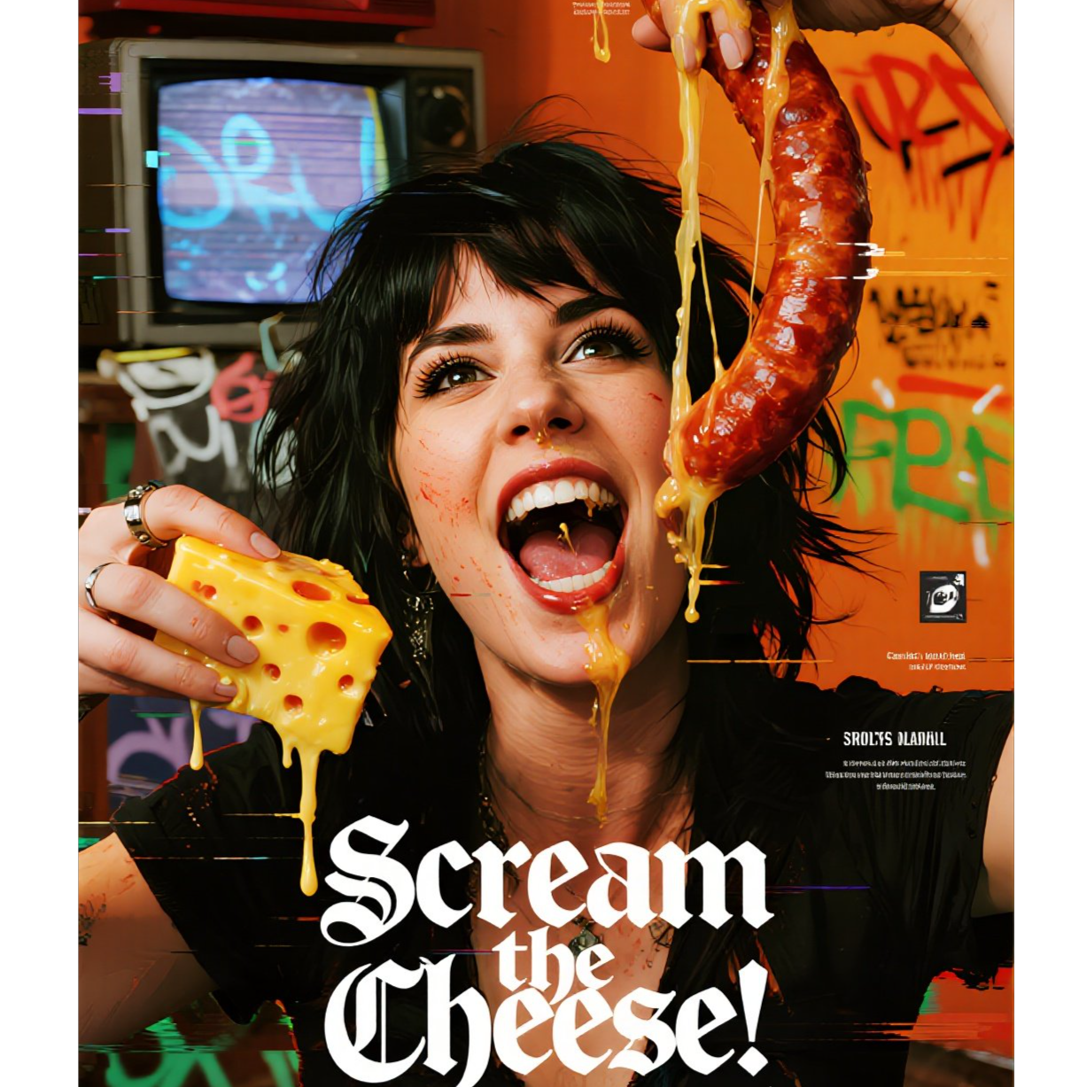 Genre: Industrial Punk, Art-Rock, Noise-Pop Fusion, Tempo: 130 BPM - sharp, jumping, rhythmically destabilized, Drums: dirty, overdriven and distorted, like banging pots, Guitars: noisy, feedback, punk riffs with jagged pauses, Synths: VHS glitches, children's toy samples, distorted TV show sounds, Bass: harsh, overdriven, as if "stumbling" in rhythm, Vocals Vera: Verses - deliberately theatrical, almost spoken word; Chorus - hysterical choral, with screams and backing vocals like a children's choir with a satanic tint; Finale - crooked autotune, laughter, coughing, and a sudden bang, as if everything exploded, Ending: Cuts off to laughter and the sound of a VHS title card