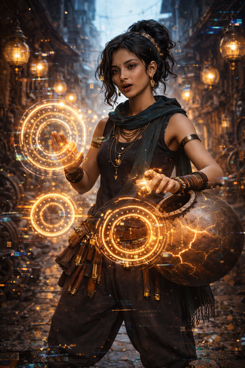 Female lead vocal, โrhythm-coderโ vibe; Carnatic percussion (mridangam/kanjira/ghatam) fused with broken beat / IDM glitch; deep sub-bass, tight punchy drums, stutter edits, granular synth textures, subtle tanpura-like drone, cinematic alley ambience, call-and-response konnakol hooks, energetic but not pop, no Bollywood, Mix Notes: