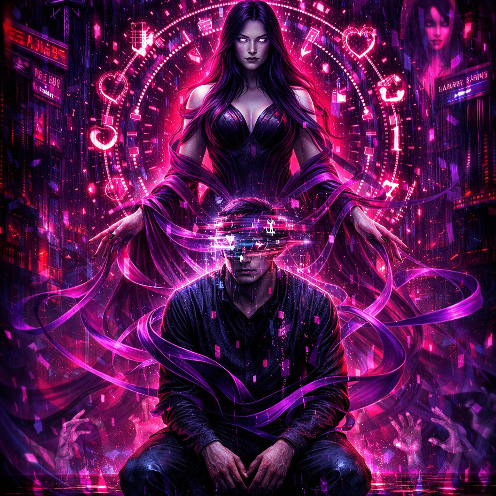 A dark, ritualistic Progressive Metal / Shock Rock track in D Phrygian Dominant (Drop D/Drop C), built on odd-time verse chugs (7/8 or 5/4) that snap into a wide 4/4 half-time anthem chorus, Male gritty tenor/baritone vocals shift from close-mic whispers to commanding, theatrical hooks, Industrial FX, reverse delays, and noise textures frame the โvoodooโ theme as digital control and psychological possession, with a final chorus key-lift (DโEb) and choir-distorted shout for maximum impact