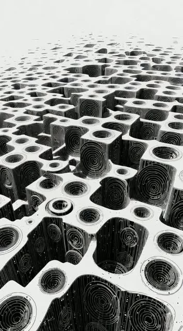 Minimal, ultra-focused rhythmic structure with no melody, Pulsing clicks and micro-percussive textures echo like neurons firing inside a geometric void, Cold, mathematical groove that repeats with hypnotic precision, yet subtly evolves like a living organism breathing under a microscope, Tight low-end patterns move with biological fluidity, creating a sense of inevitable forward motion and rising expectation, Monotone palette, abstract, inorganic, high-contrast sonic space, Patterns behave like shifting grids, concentric circles, fractal symmetry, and cellular growth, A strange and uncanny atmosphere—sterile, yet undeniably alive, Dream-state immersion, steady minimal rhythm, tension building through microscopic variation, no harmonic progression