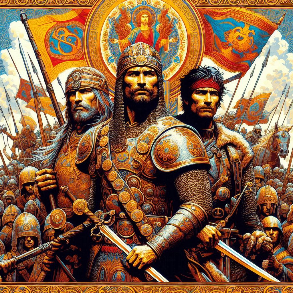 An epic film score orchestral folk rock symphony with traditional Russian folk influences, Deep male choirs, soaring strings, powerful brass, and dramatic percussion blend with rock guitars and drums, Balalaika, accordion, and violin weave in authentic Russian folk melodies, The arrangement builds from quiet, solemn spoken word and soft strings into a cinematic explosion of sound—triumphant, emotional, and unforgettable, The tone is heroic, noble, and spiritual, honoring a great man who stands for peace, family, and humanity