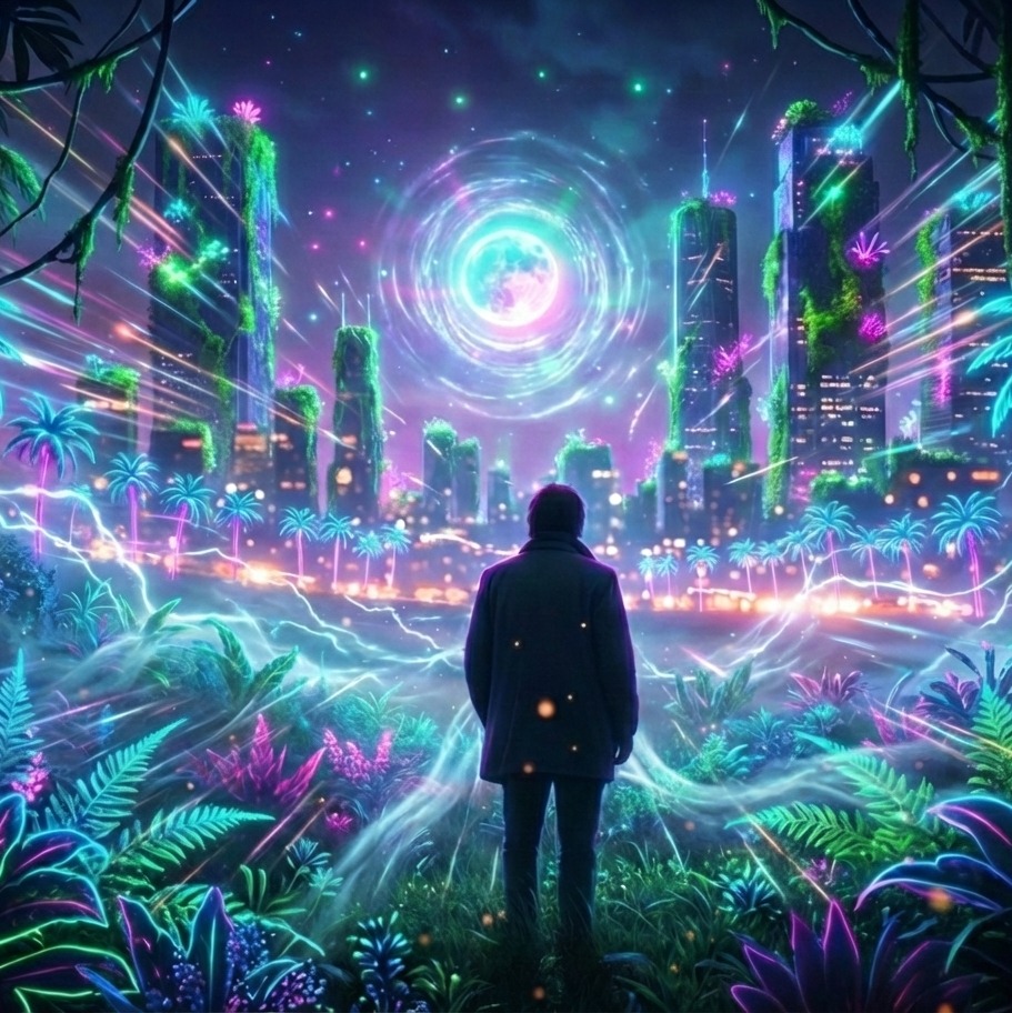 The track opens with lush ambient synths, space sounds, and a haunting electric violin riff, Raspy male vocals float atop pulsing synthwave pads, Verses ride deep 808s and trap hi-hats, building into epic electro pop choruses with bouncing drop sections, Smooth transitions link aggressive trance-infused bridges, progressive galactic layers, and melodic hip hop grooves for a darkly futuristic sound