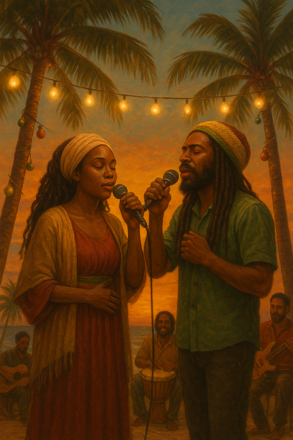 Traditional roots reggae Christmas song with a slow to mid-tempo one-drop rhythm, Female vocals, Warm, deep bassline, gentle rim-shot snare, soft kick on the third beat, and steady skanking guitar on the off-beats, Organic live feel with subtle percussion, light organ bubbles, and restrained horn accents, Calm, soulful male lead vocal with natural vibrato, supported by soft harmony backing vocals, Peaceful, spiritual, and uplifting mood inspired by classic 1970s roots reggae, focused on unity, gratitude, and conscious holiday celebration