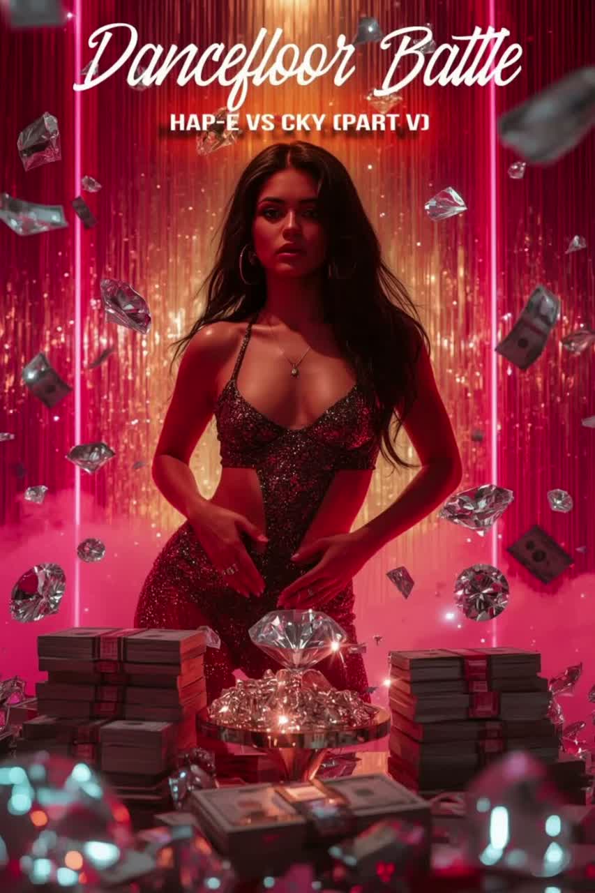 future rave dance battle energy; neon coliseum atmosphere; jungle chaos flashes; cinematic showdown scale; bass reactive lights; crowd roar ambience; stomp and shuffle FX; toprock, six step, windmill movement cues; wide supersaws; tight sub bass; sharp transient drums; stereo arps; festival drop intensity; call and response hype; two voice contrast (Happy warm and steady, See Kay Why wild and gritty); clean rap delivery; smooth sung sections; crisp vocal separation; no narration; no scene description; high impact transitions; uplifting arena feeling; world building sound design; occasional short hype ad libs (Happy, See Kay Why, lets go, bring it) without replacing lyrics