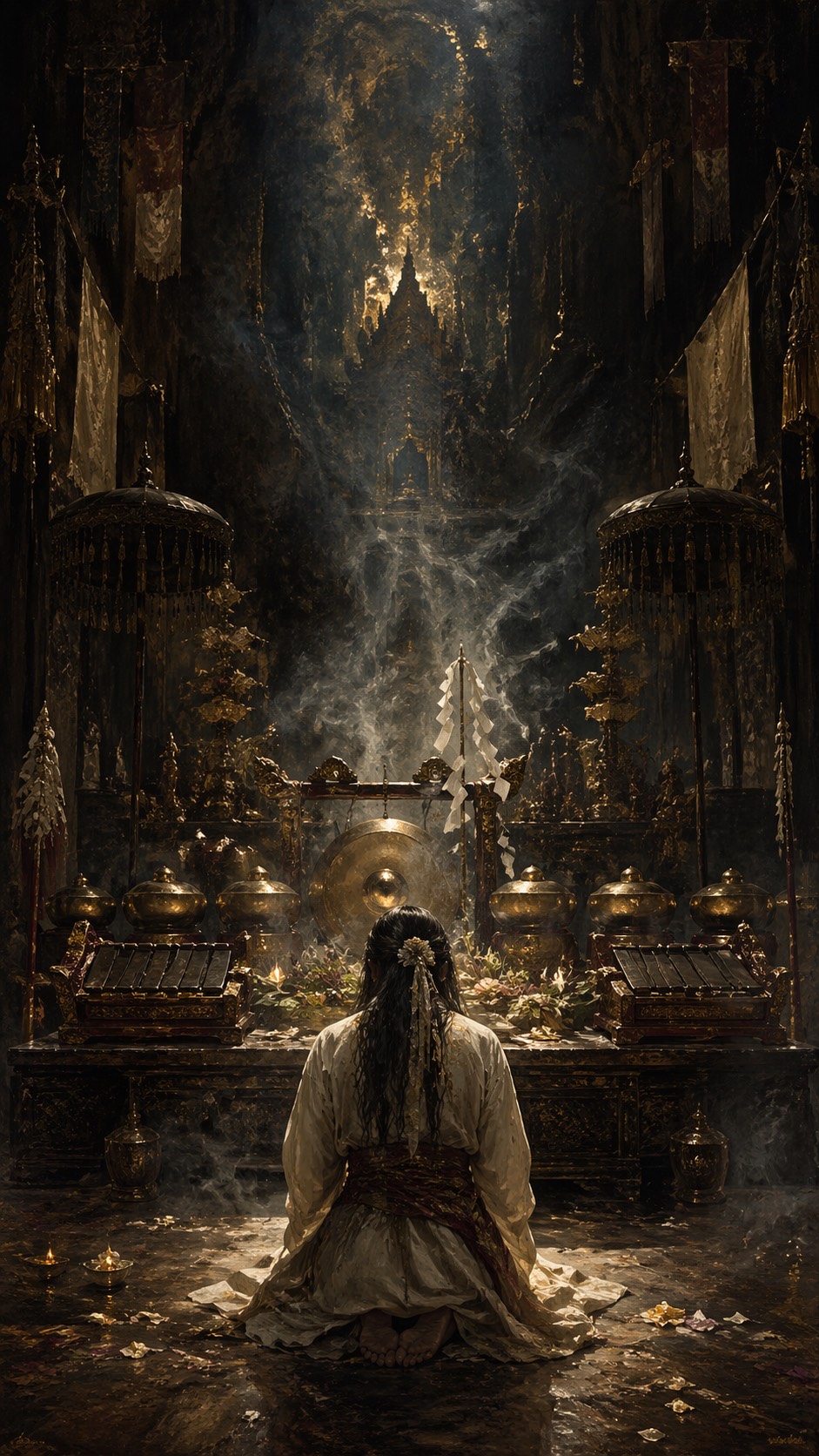 Traditional Javanese Gamelan Instrumental, metallic percussion, bonang, saron, kenong, gong cycles, kendang-guided flow, spacious cyclical motion, ritual atmosphere, refined ceremonial tension, mystical resonance, not triumphant, not pop-forward