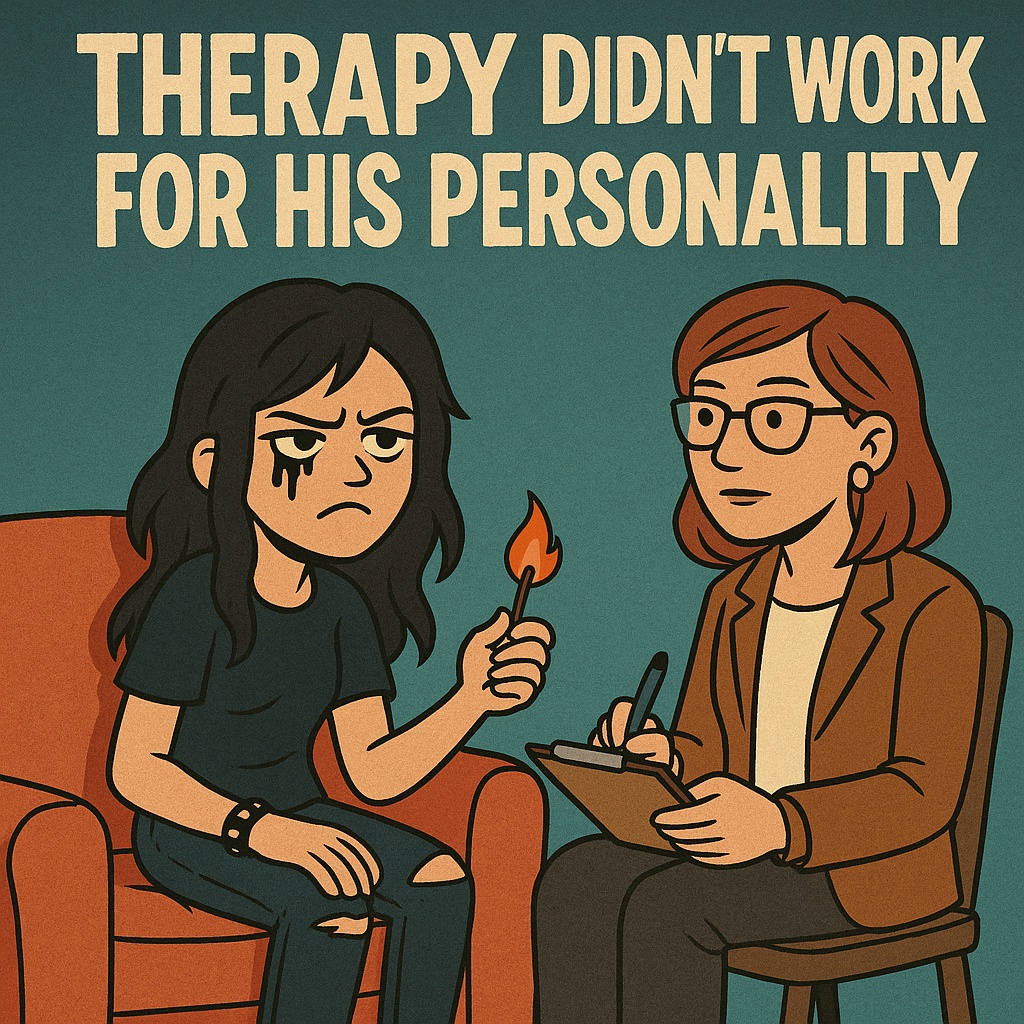 Fast-paced alt-pop with grunge guitars and theatrical dark pop energy, Male vocals with a sarcastic, emotionally unhinged tone — shifting between rhythmic spoken delivery and explosive melodic chanting, Fuzzy basslines and distorted power chords clash with trap-influenced drums and glitchy synths, Verses are tight and sardonic, while the chorus bursts with layered vocals and dramatic intensity, Blends raw angst with digital grit and pop structure, Themes of toxic codependency, emotional collapse, and romanticizing destruction, Imagine therapy sessions in hell, heartbreak with eyeliner, and a Barbie therapist holding a glowing pink pistol