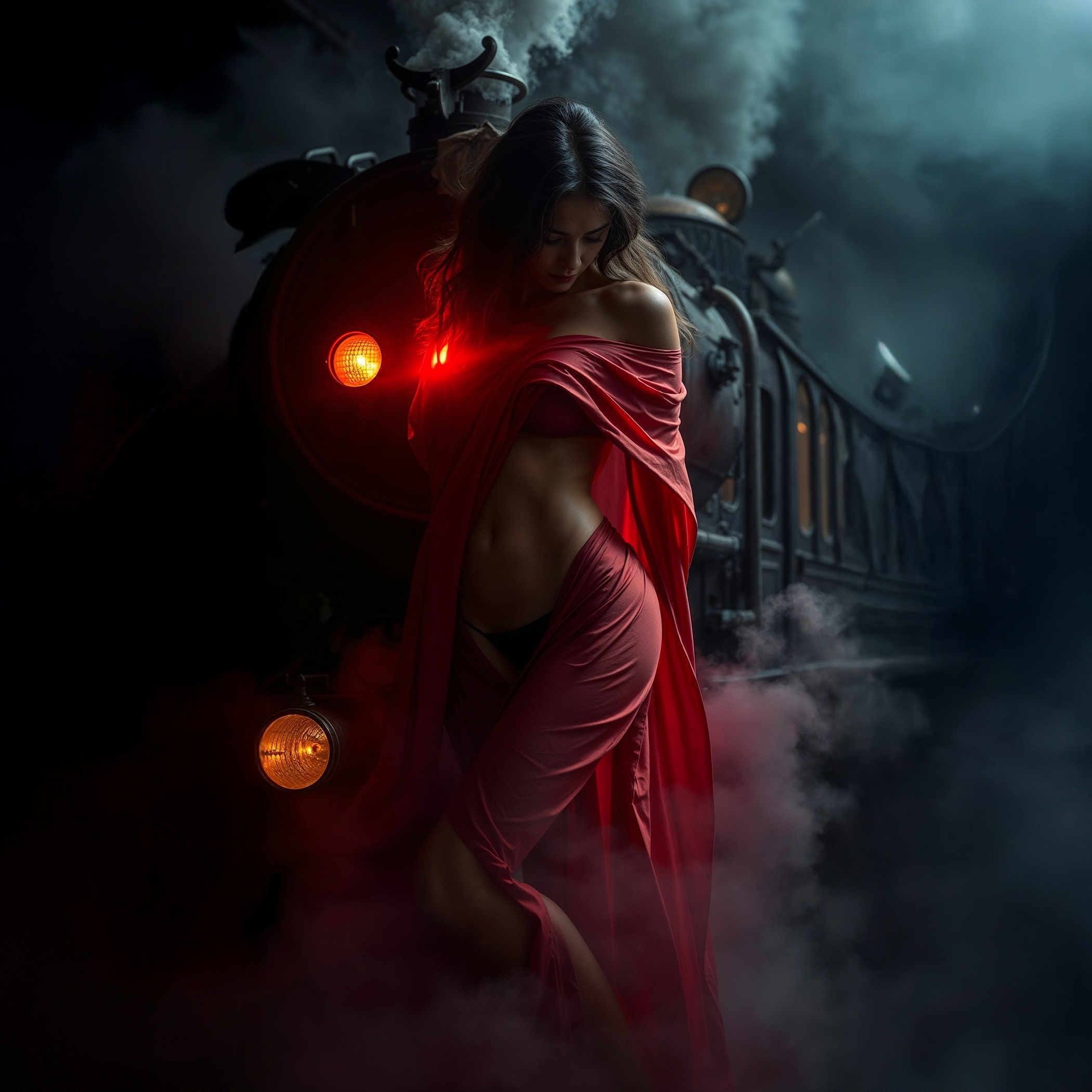 A sultry, cinematic blend of neo-soul, R&B, and alternative trap with hints of electro-pop and industrial textures, Smooth synth pads and lo-fi beats lay the foundation, layered with moody basslines, dusty snares, ambient train-inspired harmonica licks (approaching, passing, fading), and pulsing sub-bass, Verses float on syncopated rhythms, filtered keys, and sensual vocal phrasing—reminiscent of early sexy night club singer, smoky and expressive, The chorus lifts with synthwave shimmer, trap hats, and harmonized vocals that swell like steam, Hooks ride hypnotic vocal loops, while instrumental breaks feature harmonica solos mimicking distant locomotives, Intro opens with atmospheric hum, steel percussion, and harmonica wind, Bridge builds with distorted textures and echoing snaps, Outro fades like a train at dusk, Tempo: 78–82 BPM, Key: B minor, Tags: neo-soul, alt-R&B, trap soul, lo-fi beats, train harmonica, female sultry vocals, synthwave textures, railroad bordello noir, ‑exclude " fuzz ' atmospheric reverberation