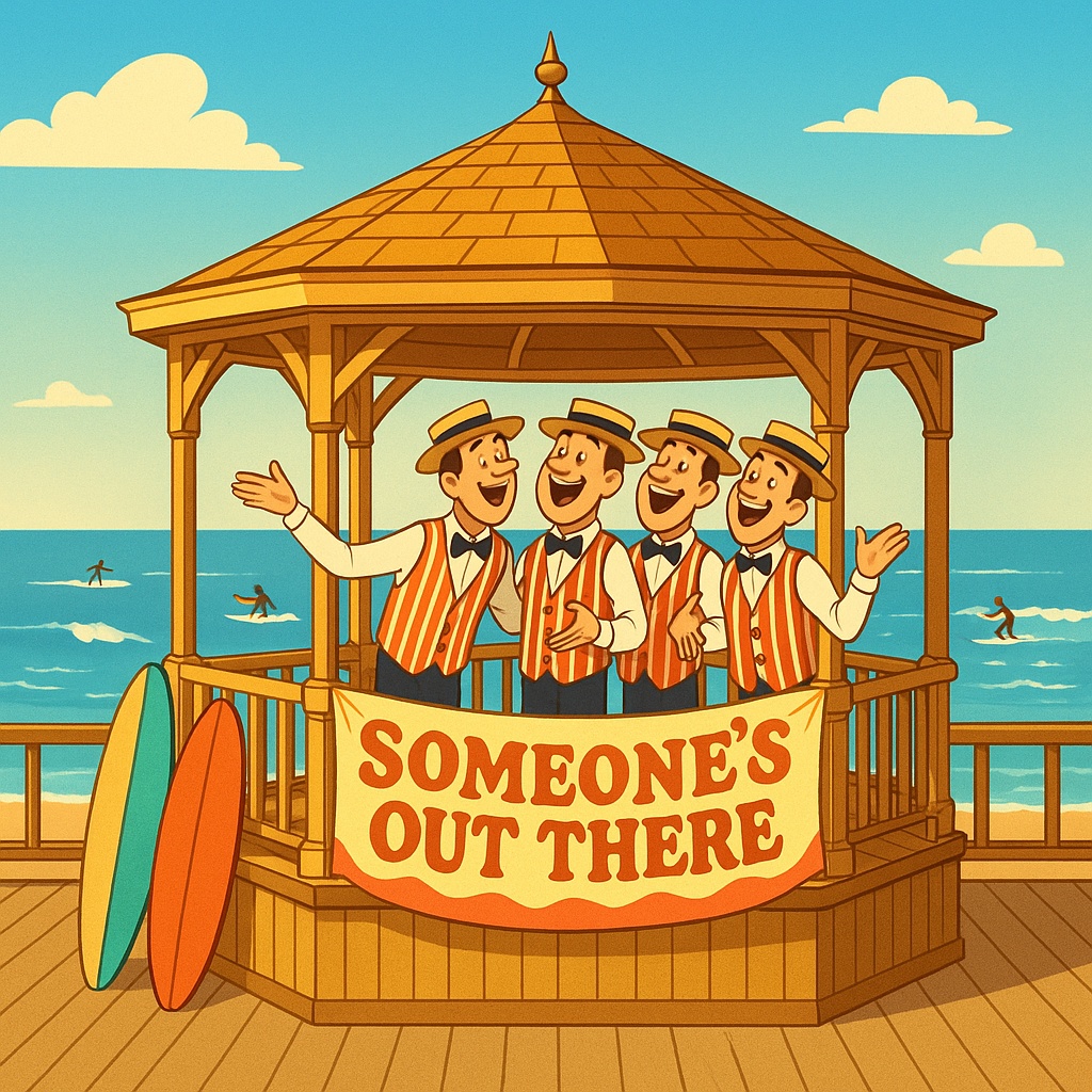 Reverb-soaked electric guitar drives a surf rock groove, crisp snare and playful walking bass lock in the rhythm, Percussive ukulele adds spark, while melodica weaves countermelodies in verses, Catchy call and response chorus features doo wop beat, upbeat barbershop harmonies, handclaps, and light piano fills