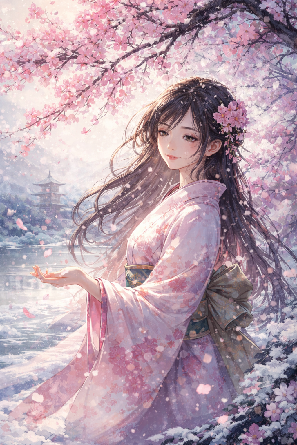 Beautiful and bittersweet Japanese-style song inspired by winter cherry blossoms blooming against the cold, Medium-slow tempo with gentle forward motion, not a ballad drag, Emotional Japanese rock foundation with clean and lightly distorted electric guitars, warm bass, and restrained but expressive drums, Traditional Japanese instruments are essential: koto arpeggios adding delicate shimmer, shakuhachi breathy tones expressing loneliness, and subtle taiko for deep, slow pulses — all blended organically, never overpowering, Female vocal, soft yet resolute, clear and intimate, expressing quiet love, longing, and graceful acceptance, Mood is elegant, fragile, and sincere — smiling while knowing the pain of parting, Harmony feels calm and refined, with emotional swells in the chorus like petals falling in slow motion, No aggression, no cyber elements, purely organic and poetic, Strong sense of Japanese aesthetics, wabi-sabi, fleeting beauty, and emotional warmth lingering after the final n