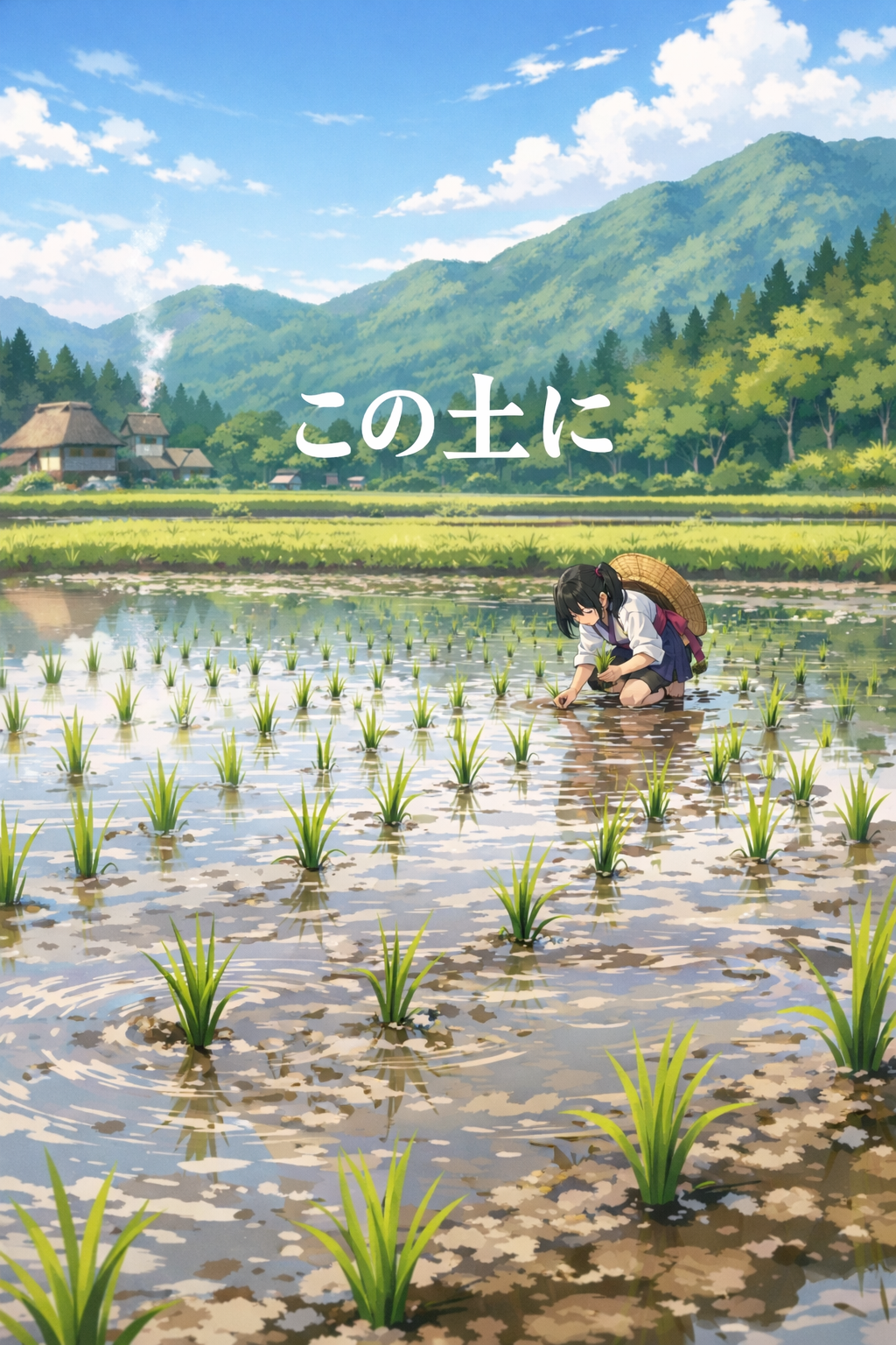 rio core, Japanese folk rock with choir, Warm and earthy atmosphere, Traditional Japanese instruments such as shamisen, koto, and taiko blended with acoustic guitar and light electric guitar, Moderate tempo, steady rhythm like farm work, Female lead vocal, gentle and calm, Mixed choir in the chorus, sounding like villagers singing together, Not prayer-like, but daily life and honest labor, Bright daytime feeling, rural village, rice fields