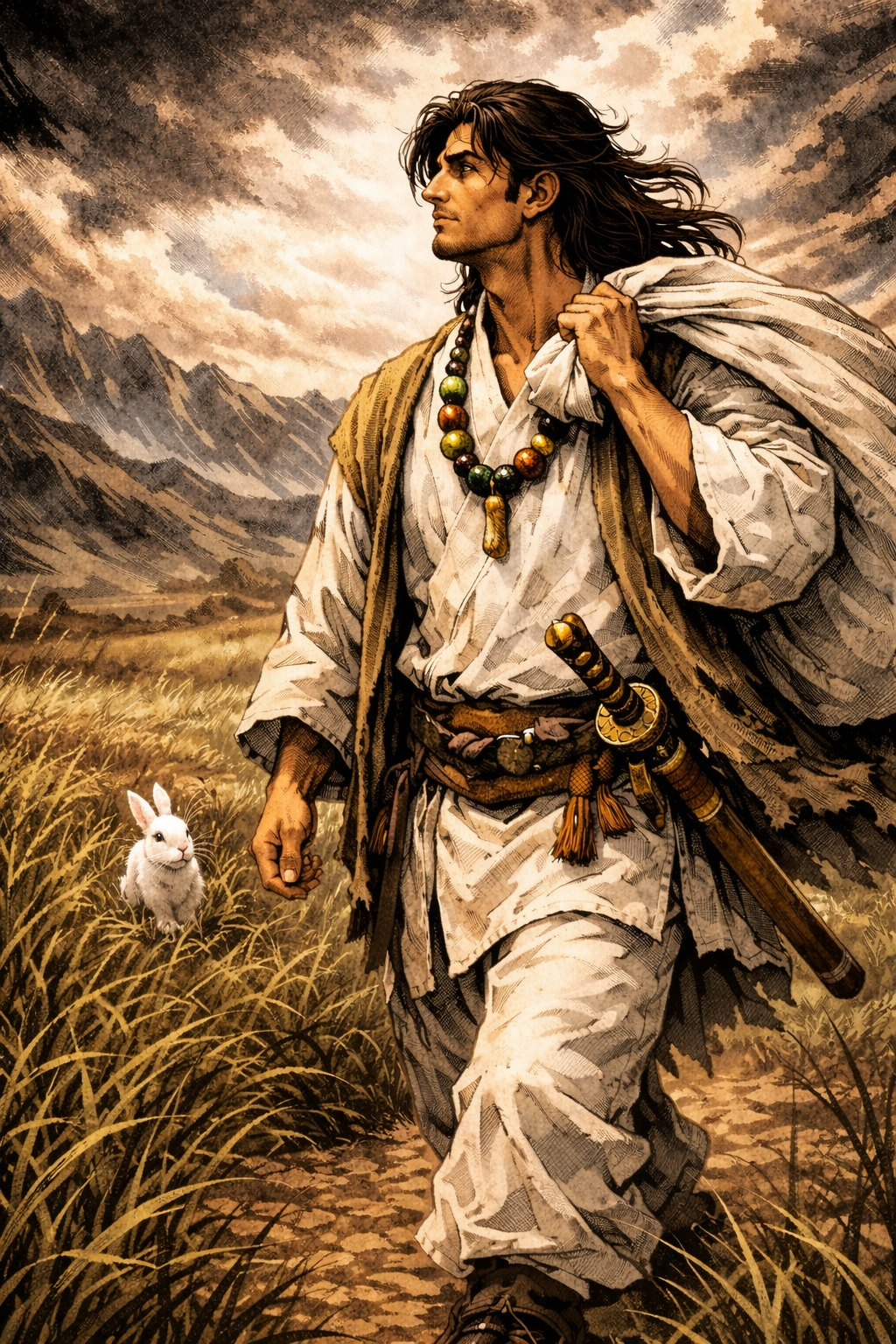 newmedal Instrumental nostalgic Japanese fantasy music for a heroic memory scene, Slow tempo, concise length, The bass role is performed by shamisen, steady and restrained, leaving space between notes, The main melody is played by traditional Japanese bamboo flute, breathy and expressive, Light cymbal swells are used very sparingly as emotional accents, never rhythmic, appearing only at phrase endings and during the brief heroic swell, Melodic contour is noble and simple: starting in the mid-low register, rising once with strength, gently falling back, repeating with slight variation, briefly reaching a higher register for a heroic moment, then returning to a quiet ending, Structure: soft introduction → clear main theme → darker variation → brief heroic swell → subdued reprise, Occasional distant temple bell as a non-rhythmic accent, Minor key with modal color, wide stereo space, soft reverb, intentional silence, Strictly instrumental, no vocals