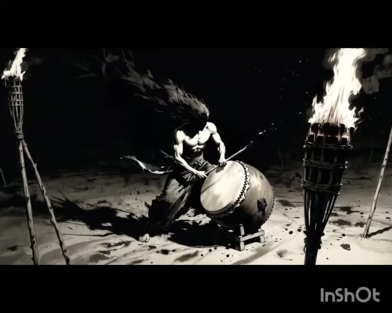 Traditional Japanese ritual taiko music dedicated to the gods of fire and thunder, Yamato-style taiko is the main instrument and core, with heavy odaiko pulses and sharp shime-daiko strikes creating fierce rhythms and strong ma (silence), All other instruments are traditional Japanese instruments used strictly for rhythm, Ritual vocal lines are included, strictly in Japanese phonetic norito style only, Aggressive tempo with sudden explosive hits, Sacred, primal, and mystical atmosphere, Pure taiko-centered ceremonial offering, No Western, electronic, or modern instruments, No English or non-Japanese vocal sounds, ‑Chorus, ‑humming, ‑Harp, ‑Guitar, ‑Piano, ‑cymbals