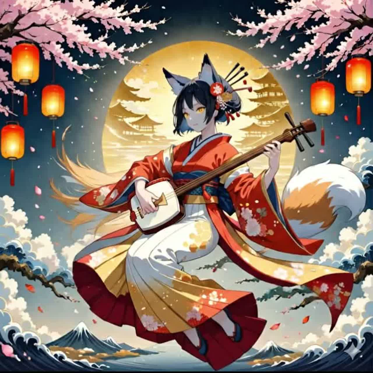 Japanese Pop, Wafu Fantasy, World Fusion, Cinematic, A Japanese-style fantastical and majestic fox song, Female Vocal, Tempo: Mid-Tempo, cheerful but sentimental Instrumentation: Acoustic Guitar, Upbeat Bodhrán Drum Rhythm, Fiddle (三味線) Melody, Tin Whistle (尺八) Counter-melody, Harp, Cinematic Orchestra Strings