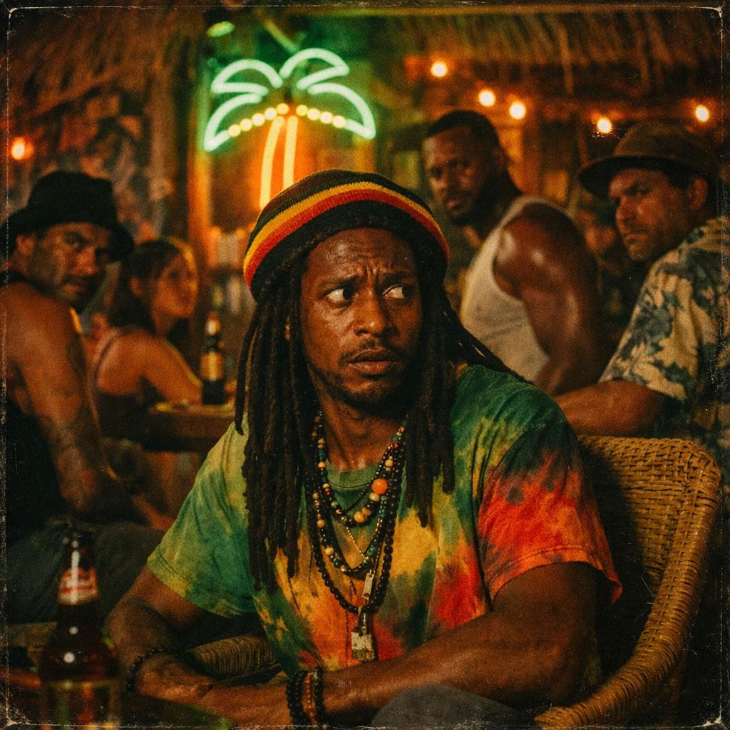 Reggae Electro Fusion zouk rap starts with a heavy bass, syncopated groove from layered 707, 808, and 909 kits drenched in synthetic reverb Hypnotic, weaving deep bass, chopped guitars, and lush pads, militant Male realistic voice lead delivers lines with natural realism, while a female chorus adds echoed harmonies, Special effects, delays, and reggae-style dropouts pulse throughout, uplifting melodious 707/808/909, synth echoed, percussion reverb and echoed