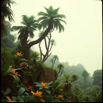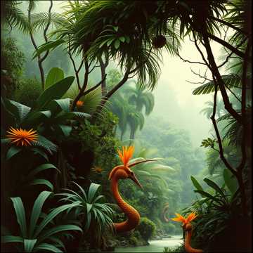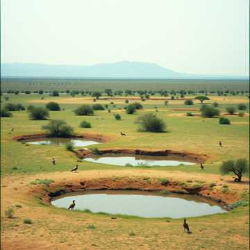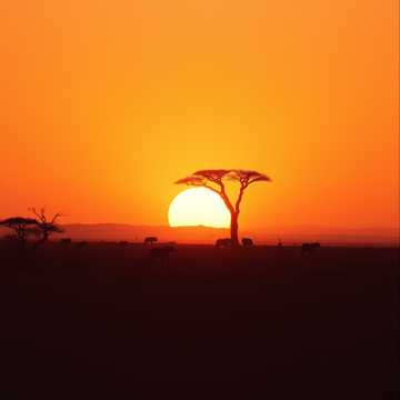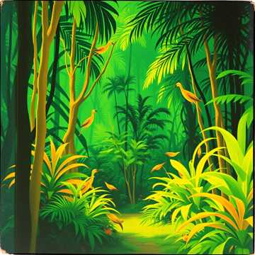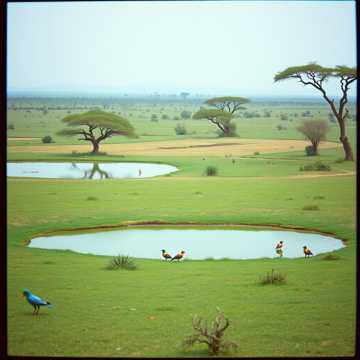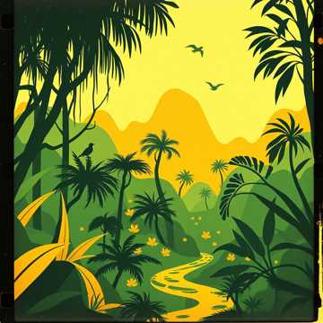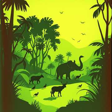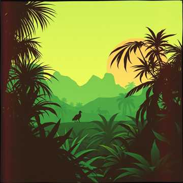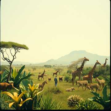 Ambient deep aerial environment music, with a sound and instruments from African national sounds and music, the style must remind a light fun and joyous style with some echoes, like background for games, with some voices background like Hey Ow, Obabua, Baba, Buba and etc with some voices of animal, like a journey in africa stage jungle