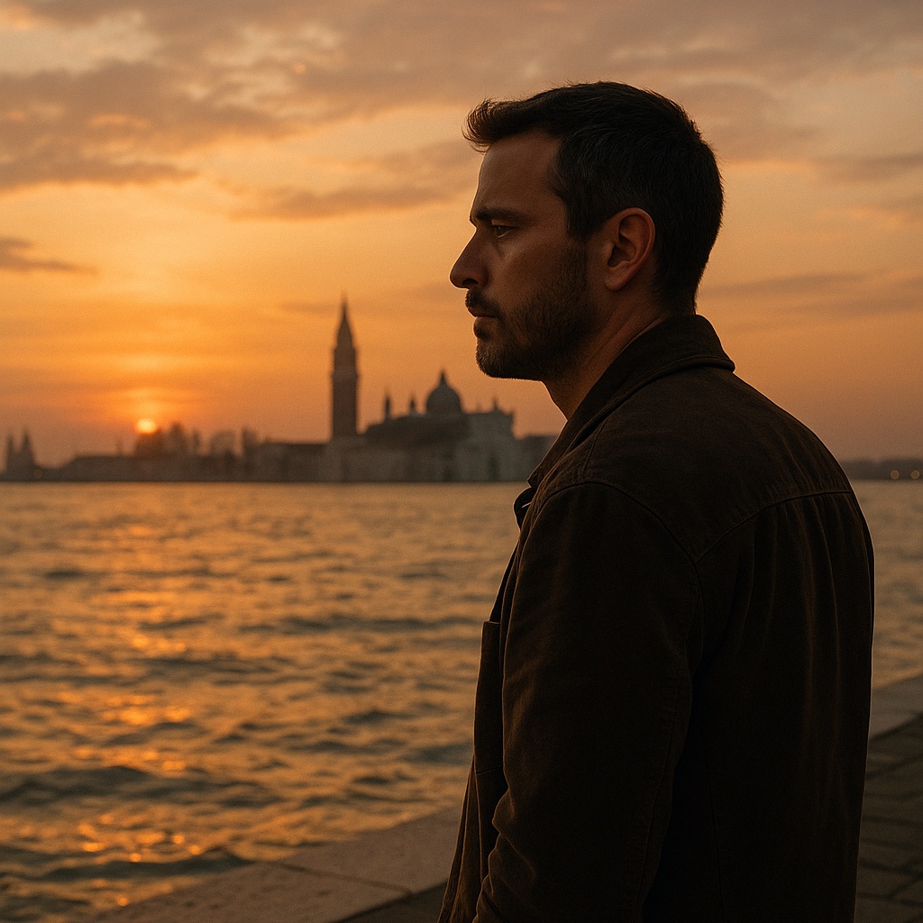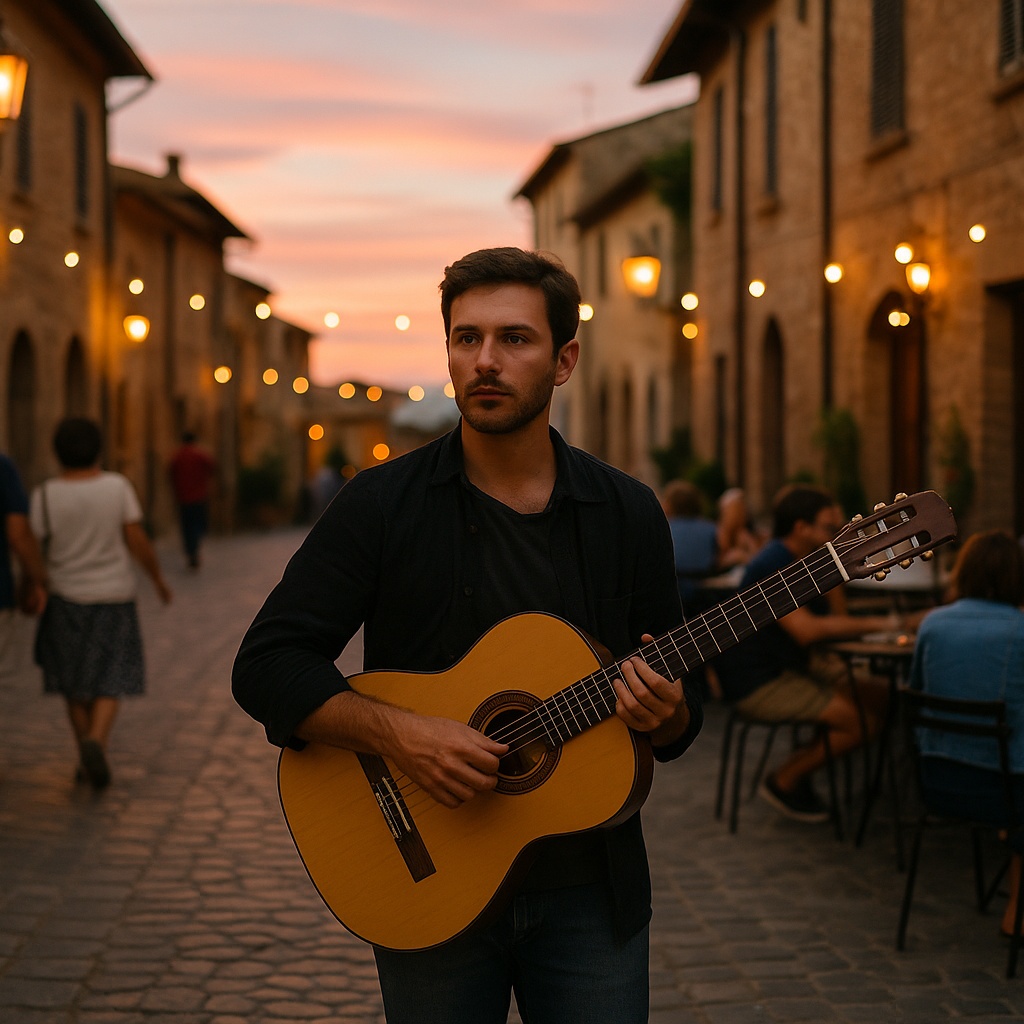 An emotional Italian pop-ballad driven by a passionate male tenor with warm vibrato and nuanced, expressive phrasing that captures intimate storytelling, The arrangement artfully balances delicate nylon guitar arpeggios with rich, swelling orchestral strings and gentle piano motifs, creating a lush, cinematic soundscape, Mediterranean percussion elements such as cajón and shaker add subtle rhythmic warmth and sensuality without overpowering the vocals, Verses are introspective and tender, featuring soft dynamics and natural phrasing, while choruses rise to powerful, soaring melodic climaxes with layered harmonies and understated background vocals, Production favors warmth and proximity with light compression and plate reverb to preserve the vocal’s natural timbre and emotional depth, evoking the timeless romanticism and melodic clarity characteristic of classic Italian pop ballads