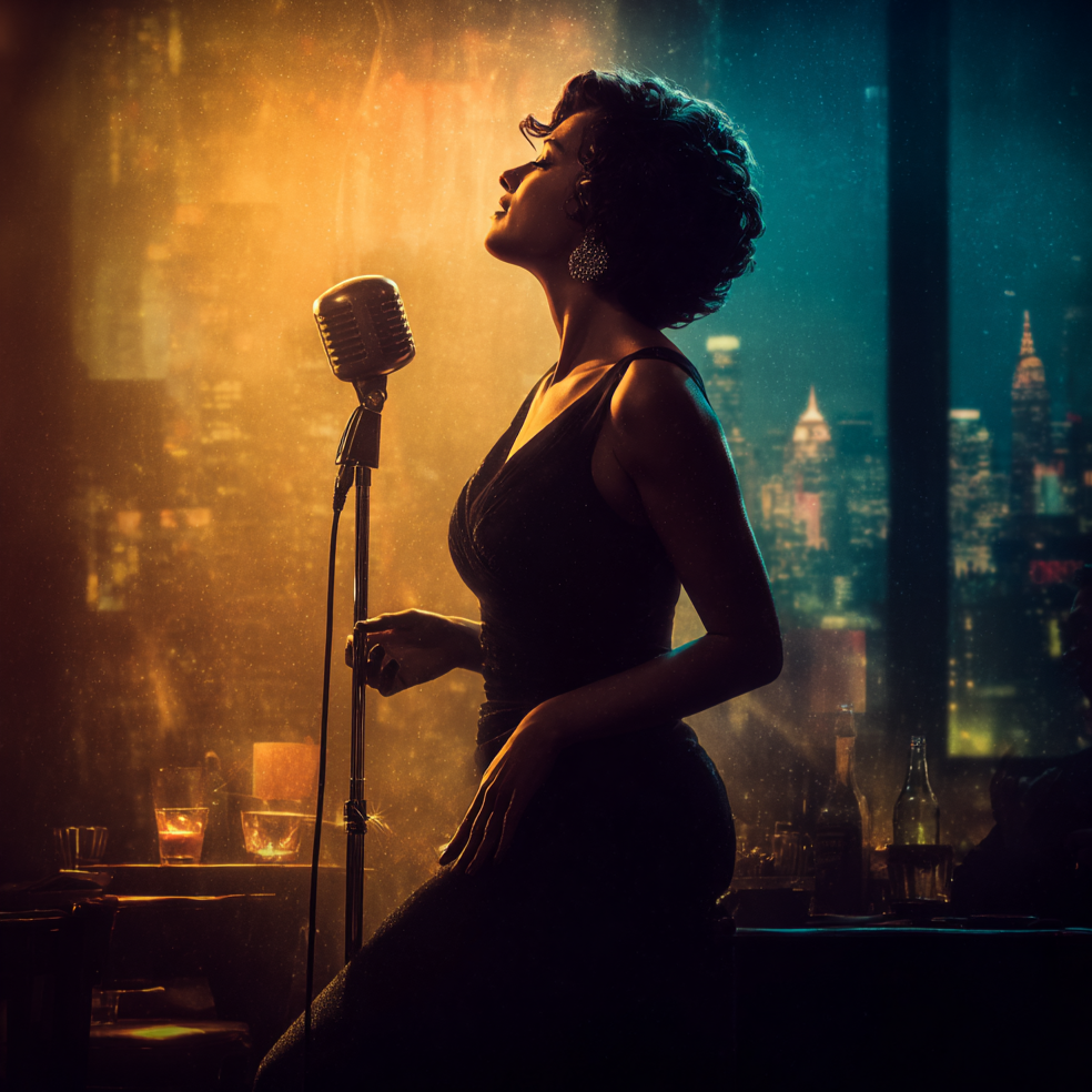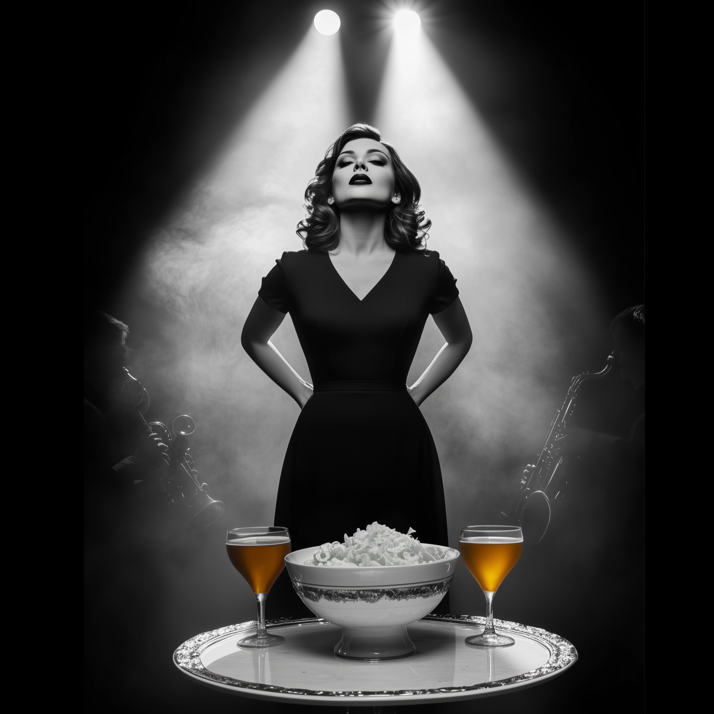 german accent, 50s, Jazz noir, soul noir, r&b, sultry female vocal, smoky vocal, fun mood, emotional performance, upright bass, rushed drums, sultry saxophone, muted trumpet, Jazz club, jazz