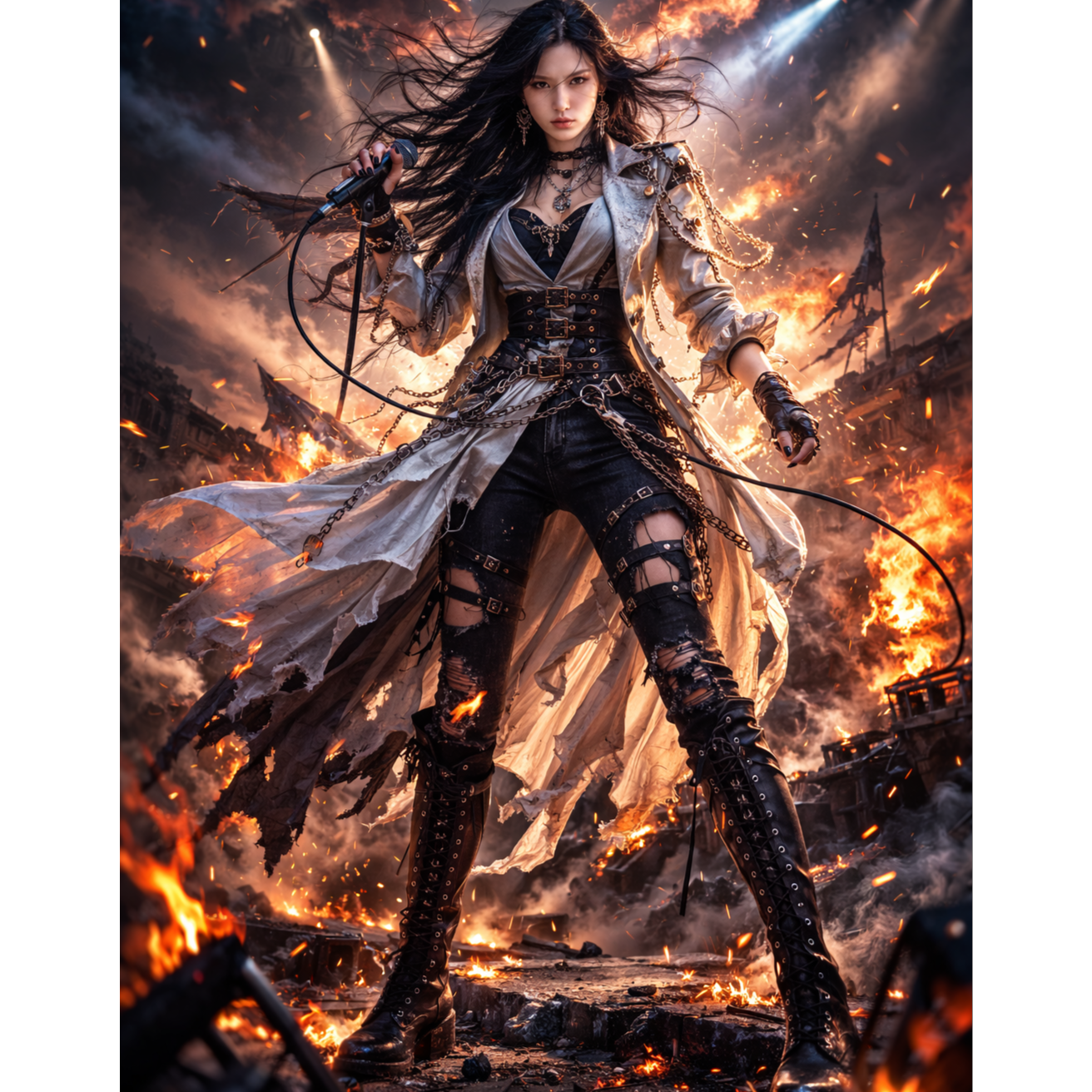 Modern heavy metalcore with powerful female lead vocal, BPM 158โ165, aggressive double bass drums, tight palm-muted guitar riffs in Drop D tuning, punchy snare, thick low-end bass, explosive pre-chorus build with half-time groove, massive anthemic chorus with open power chords, short controlled breakdown before final chorus, cinematic energy but modern metal production, Female vocal: strong chest-dominant voice, bold and forward, sustained high notes without screaming, no growl, no whisper, no gothic tone, no nu-metal rap, no trot influence, no airy or breathy sound, Clean but aggressive delivery, clear pronunciation, high presence (3โ5kHz), minimal reverb, vocal fully upfront and cutting through distorted guitars, Mix: tight and punchy drums, wide stereo guitars, powerful low-end, modern metal clarity, high impact, energetic, no muddiness, no washed-out sound, no vintage rock tone