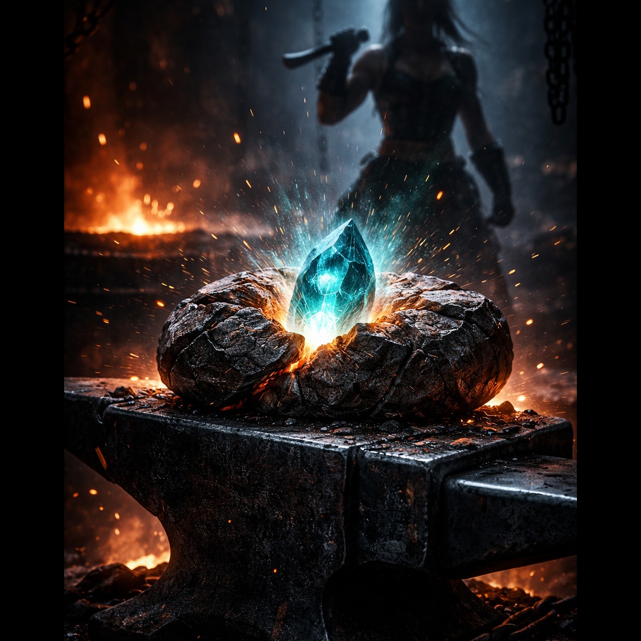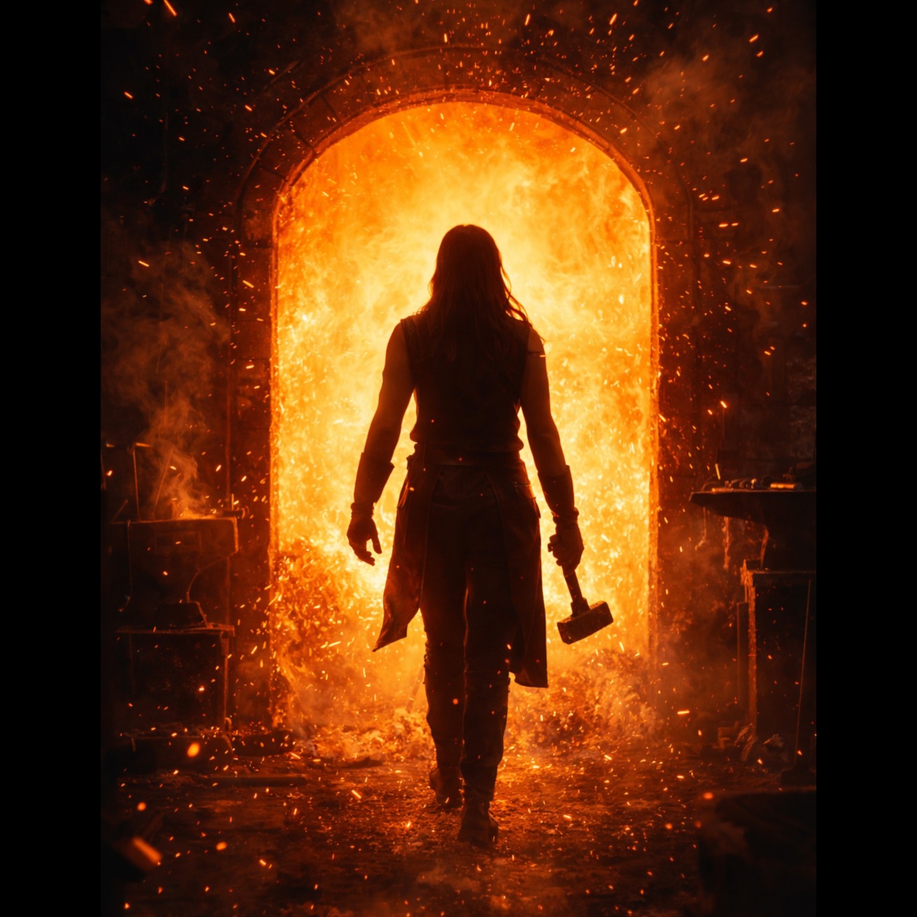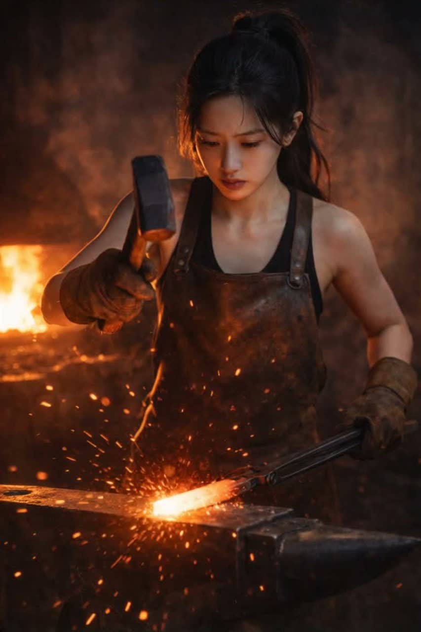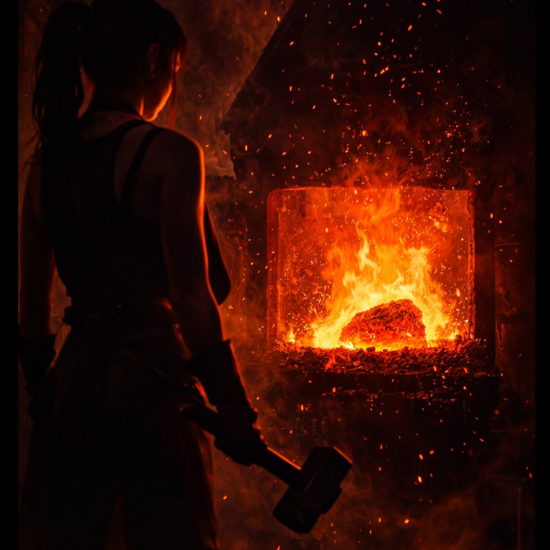 Explosive melodic heavy metal inspired by the imagery of a blazing blacksmith forge, Tempo around 112 BPM, powerful and driving rhythm like hammer strikes shaping steel, Female vocal in the style of ALI: strong chest voice, husky texture, gritty high notes and emotional power, expressive but controlled, no death growls, Vocal stays forward in the mix with intense resonance and dramatic delivery, Instrumentation: heavily distorted electric guitars with thick palm-muted riffs, powerful bass guitar, thunderous rock drums with tom fills and cymbal crashes, metallic hammer percussion layers imitating blacksmith strikes (clang, cheng, metal impact), subtle orchestral strings and piano pads for cinematic depth, Verses build tension slowly like heating steel in the forge, pre-chorus rising with guitar harmonics, chorus explodes with massive guitar walls and soaring vocals, Bridge features rhythmic hammer sounds and dark ambience before a final climactic chorus, metal hammer strikes rhythm, ind, โJ-pop, โanime soundtrack, โcity pop, โenka
