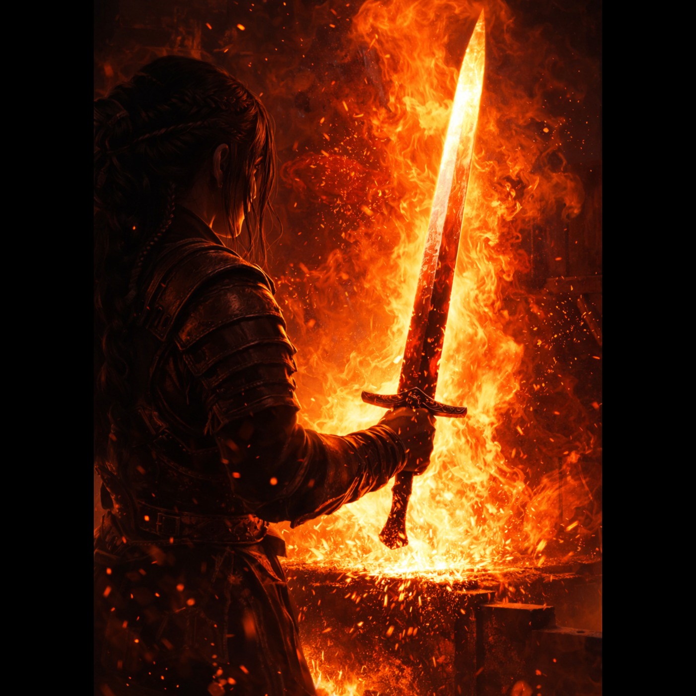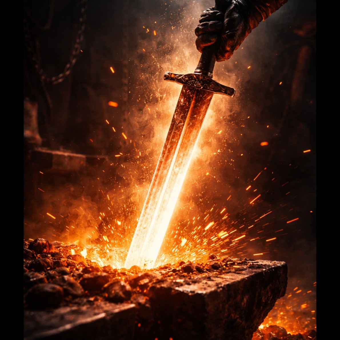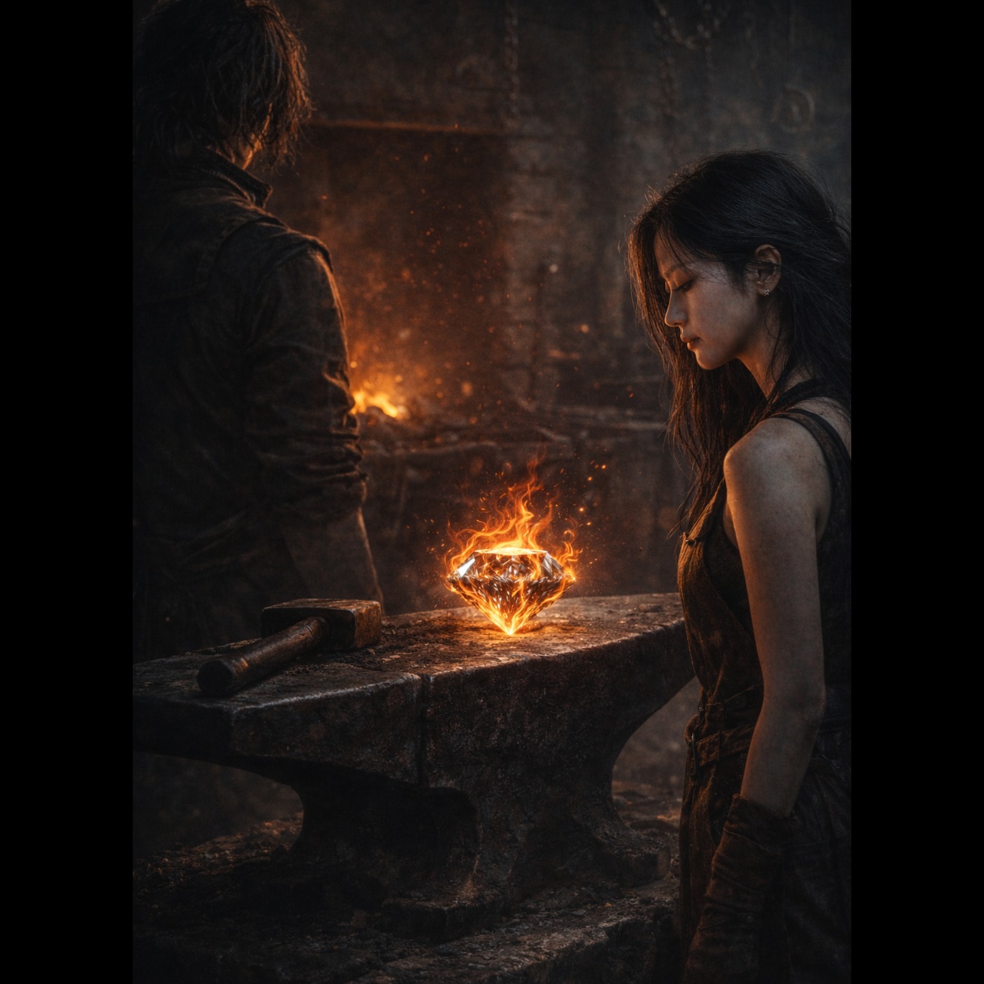 Explosive melodic heavy metal inspired by the imagery of a blazing blacksmith forge, Tempo around 112 BPM, powerful and driving rhythm like hammer strikes shaping steel, Female vocal in the style of ALI: strong chest voice, husky texture, gritty high notes and emotional power, expressive but controlled, no death growls, Vocal stays forward in the mix with intense resonance and dramatic delivery, Instrumentation: heavily distorted electric guitars with thick palm-muted riffs, powerful bass guitar, thunderous rock drums with tom fills and cymbal crashes, metallic hammer percussion layers imitating blacksmith strikes (clang, cheng, metal impact), subtle orchestral strings and piano pads for cinematic depth, Verses build tension slowly like heating steel in the forge, pre-chorus rising with guitar harmonics, chorus explodes with massive guitar walls and soaring vocals, Bridge features rhythmic hammer sounds and dark ambience before a final climactic chorus, metal hammer strikes rhythm, ind, โJ-pop, โanime soundtrack, โcity pop, โenka