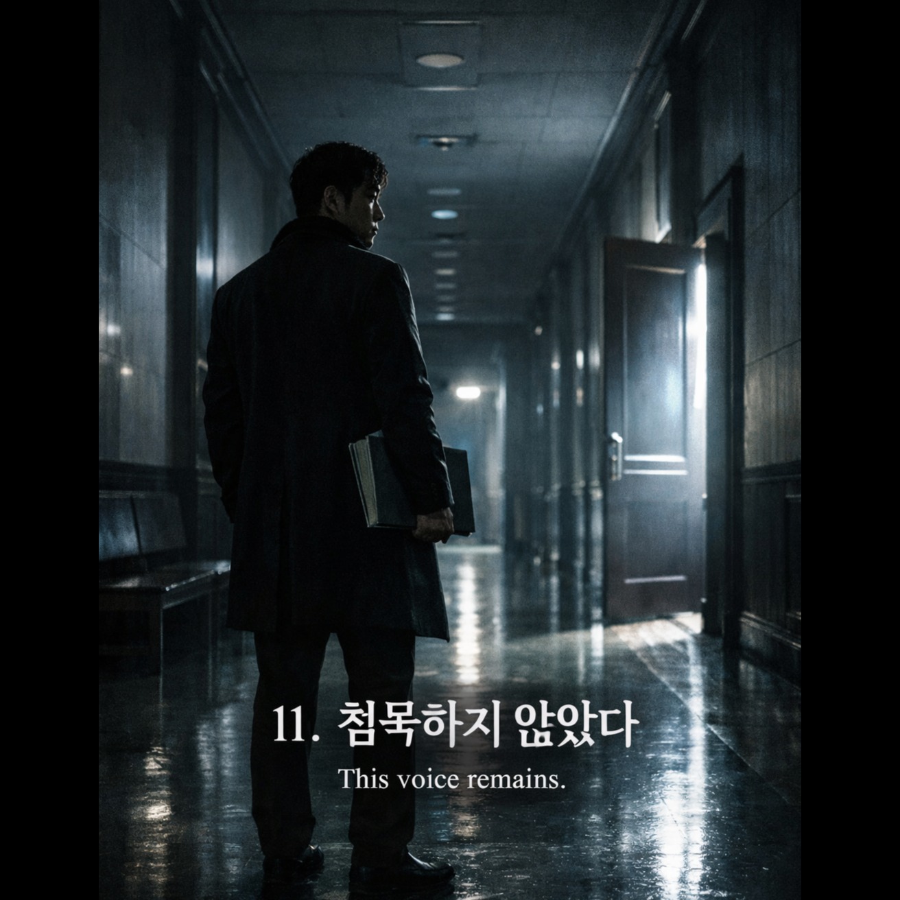 Alternative metal / post-grunge metal song at 100 BPM, minor key, Heavy but controlled distorted guitars (Drop D), palm-muted riffs in verses, open power chords in chorus, Drums are punchy and grounded, no excessive double kick, wide snare hits, tom-driven build-up in bridge, Dark, tense atmosphere with restrained aggression, Male lead vocal (J-STONE): low, steady, husky tone in verses, chest-voice dominant delivery, emotional but controlled, Chorus expands with powerful, gritty belting, no screaming, voice clearly upfront as the main narrator and witness, Lyrics focus on truth, conscience, resistance, and testimony rather than rage, Final chorus feels resolute and defiant, not heroic, ending with quiet strength, No pop or EDM elements, organic live-band sound, modern Korean alternative metal mood