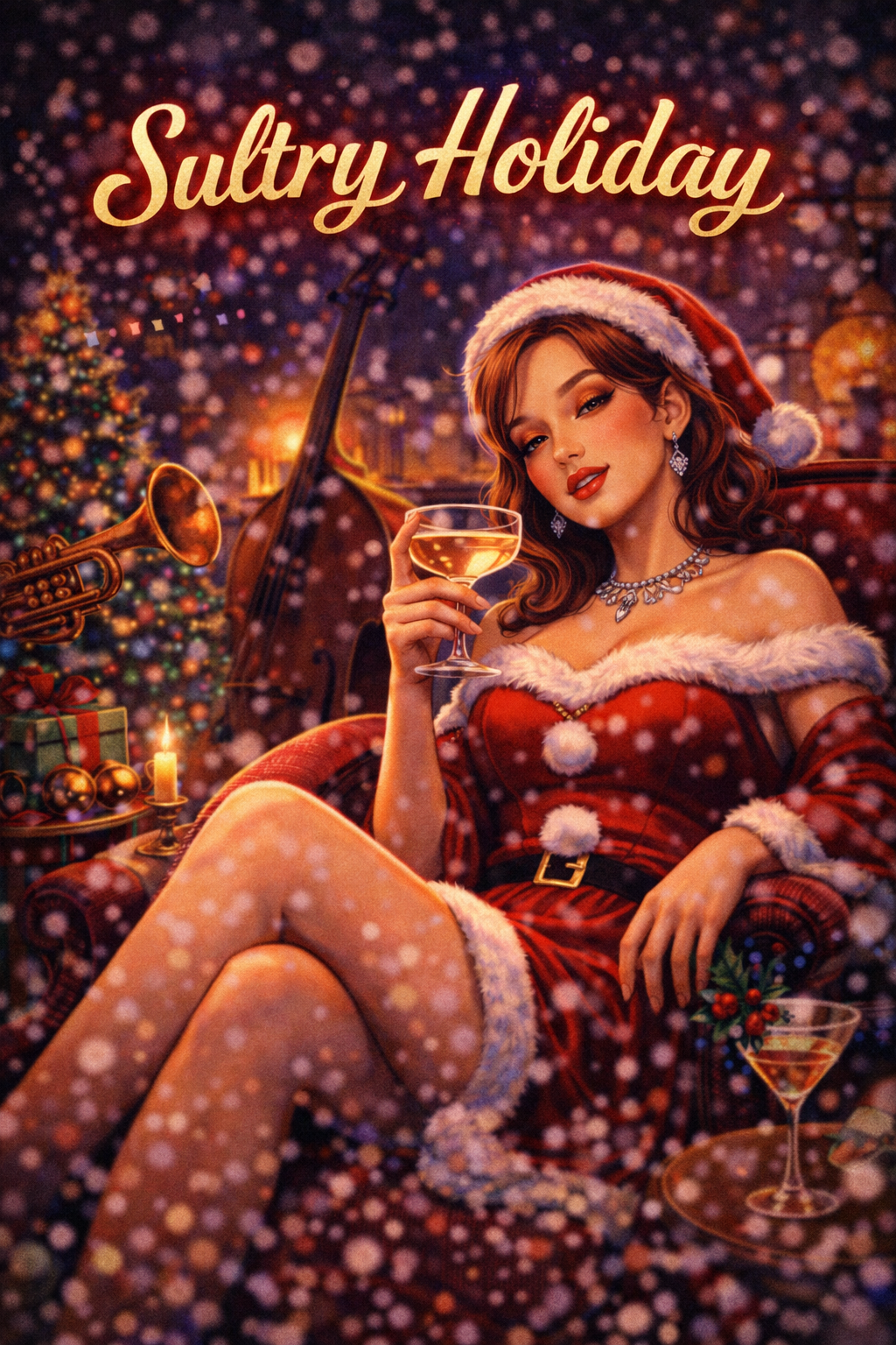 Sultry acid-jazz electro swing Christmas – slinky upright bass, Hammond organ stabs, filtered swing loops, sidechained kick, muted trumpet riffs, breathy female vocal, vinyl crackle, bluesy bends