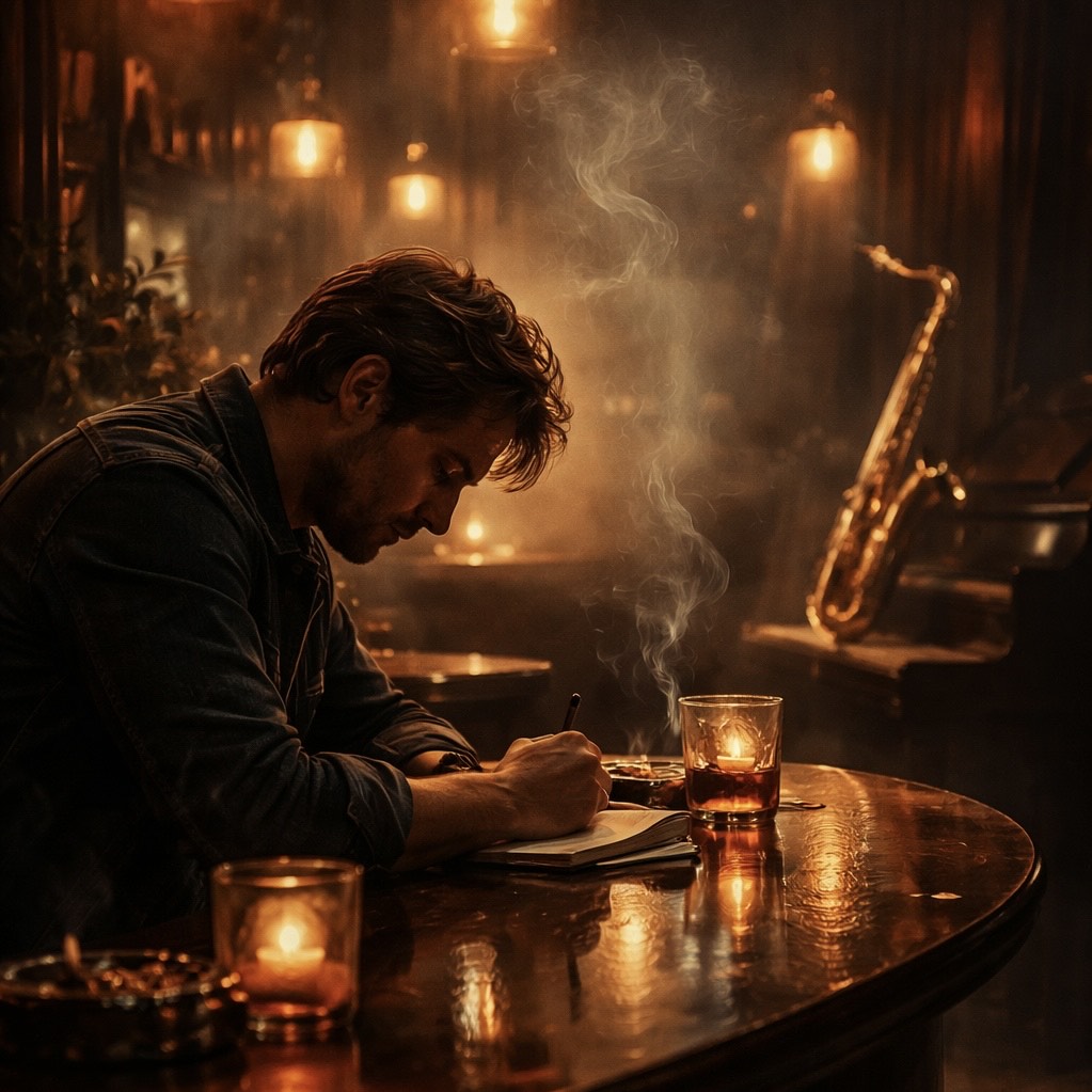 jazz, emotional but calm, male vocals, sax outro, slow, male vocals, sultry, upright bass, tone, emotional, breaks, acid-jazz blues, muted trumpet phrases, smoky phrasing, dusty drum brushes, electric, chorus, slow, late-night vibe, let the song breathe with instrumental breaks between verse, and outro, smooth soulful tone, lazy electric-guitar bends, smooth, soulful, jazz blues