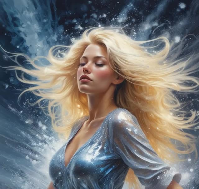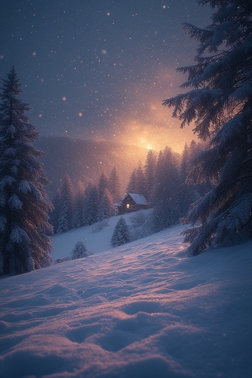 The winter-folk/ambient art-pop piece begins with warm felt piano and gently plucked folk guitar, wrapped in airy pads and haunting harmonic minor chamber strings, Intimate breathy female vocals and lush harmonies float above, Snow, wind, chimes, fire Foley craft the atmosphere, while reversed textures, deep low-end pulses, subtle reverb, and layered trip hop/R&B grooves develop into a serene, magical winter tapestry—balancing cozy intimacy with expansive, enchanted soundscapes, synth arpeggios, violin orchestra