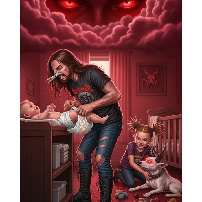 Power Metal, Symphonic Speed Metal with galloping riffs, epic choirs, blazing double kicks, male warrior vocals Heroic Heavy Metal, A blazing power metal epic about a domestic battle against a cursed diaper, told as if it were a grand war saga, Opens with spoken-word reverb and thunder SFX over ominous symphonic swells, setting a mythic tone, Galloping guitars and double-kick drums drive the verses, with commanding male warrior vocals narrating the trials, Epic choirs in the chorus exalt the “heroic” diaper change, Verses feature rapid riffing, soaring harmonies, and humorous but intense lyrical imagery, Bridge slows to a seductive yet ominous choral section before accelerating into a triumphant speed metal finale, Symphonic orchestrations, cymbal crashes, and layered guitars keep the sound massive and cinematic—equal parts bravado, march, and absurdity, ‑[compression][distortion][noise][shimmer][background noise][bad instrument][voice distortion][music distortion][echo][reverb][tinny][artificial][Shrill][Clamorous][Blaring][Piercing]