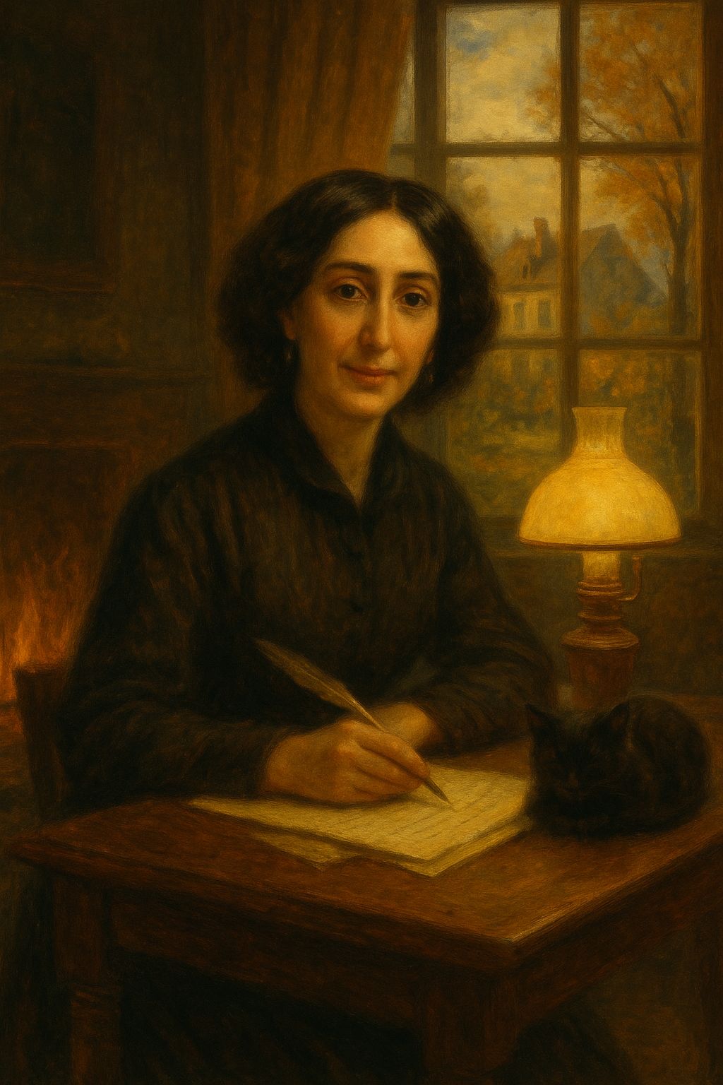 Acoustic folk with light piano and strings, touches of harp and clarinet, Warm wood textures, soft percussions, natural room reverb, Evoke the peaceful countryside of 19th-century France, candlelight, quill writing on paper, a cat purring near a crackling fire, The atmosphere should be tender, poetic, nostalgic, and quietly luminous — somewhere between folk and classical, reminiscent of old French ballads from the Berry region, Avoid modern pop elements or heavy drums, Focus on warmth, storytelling, and emotion