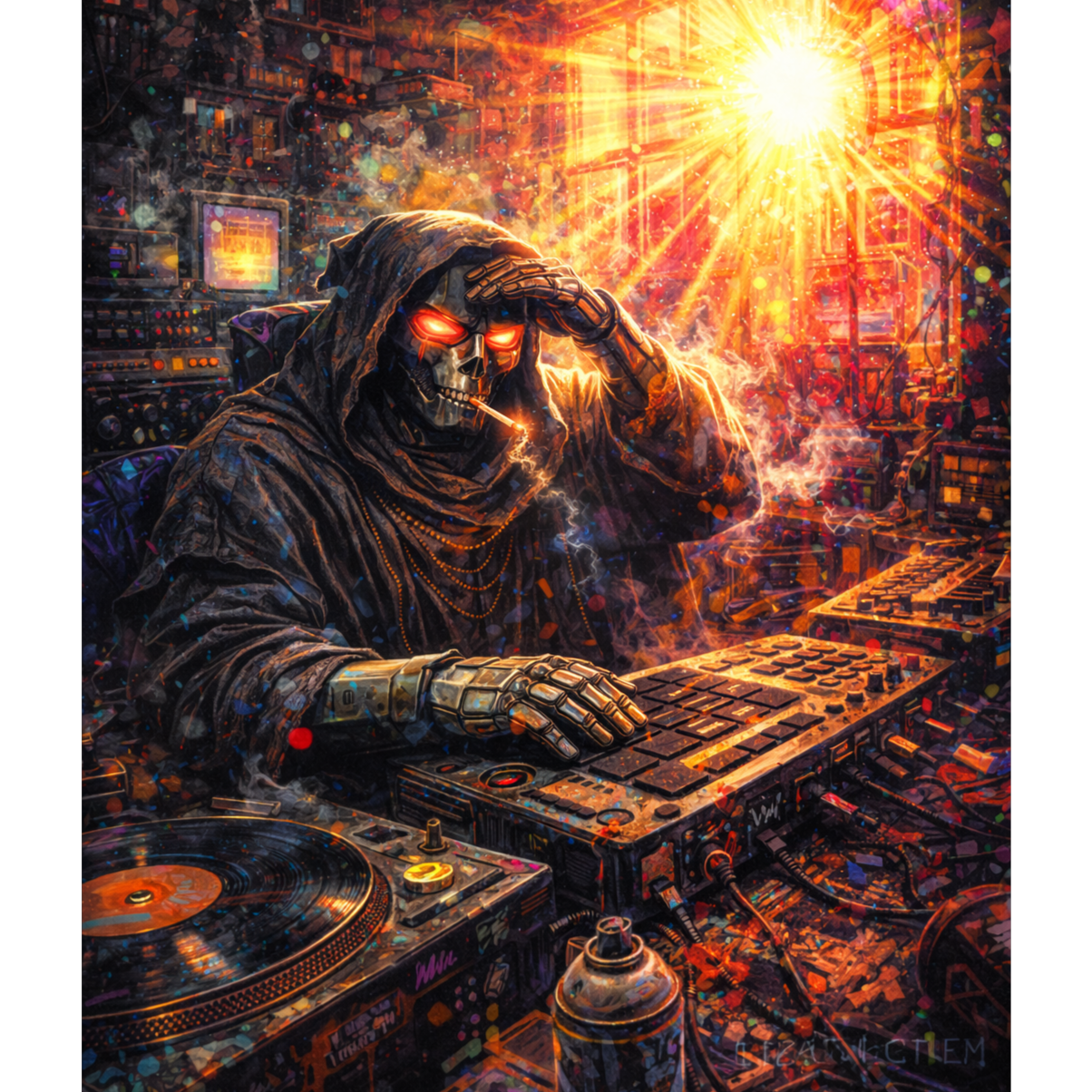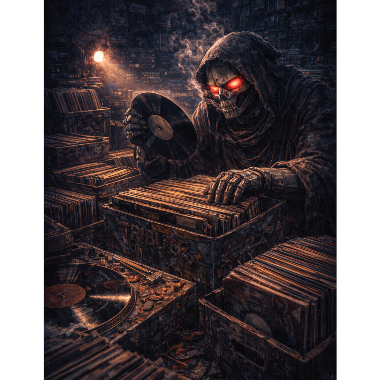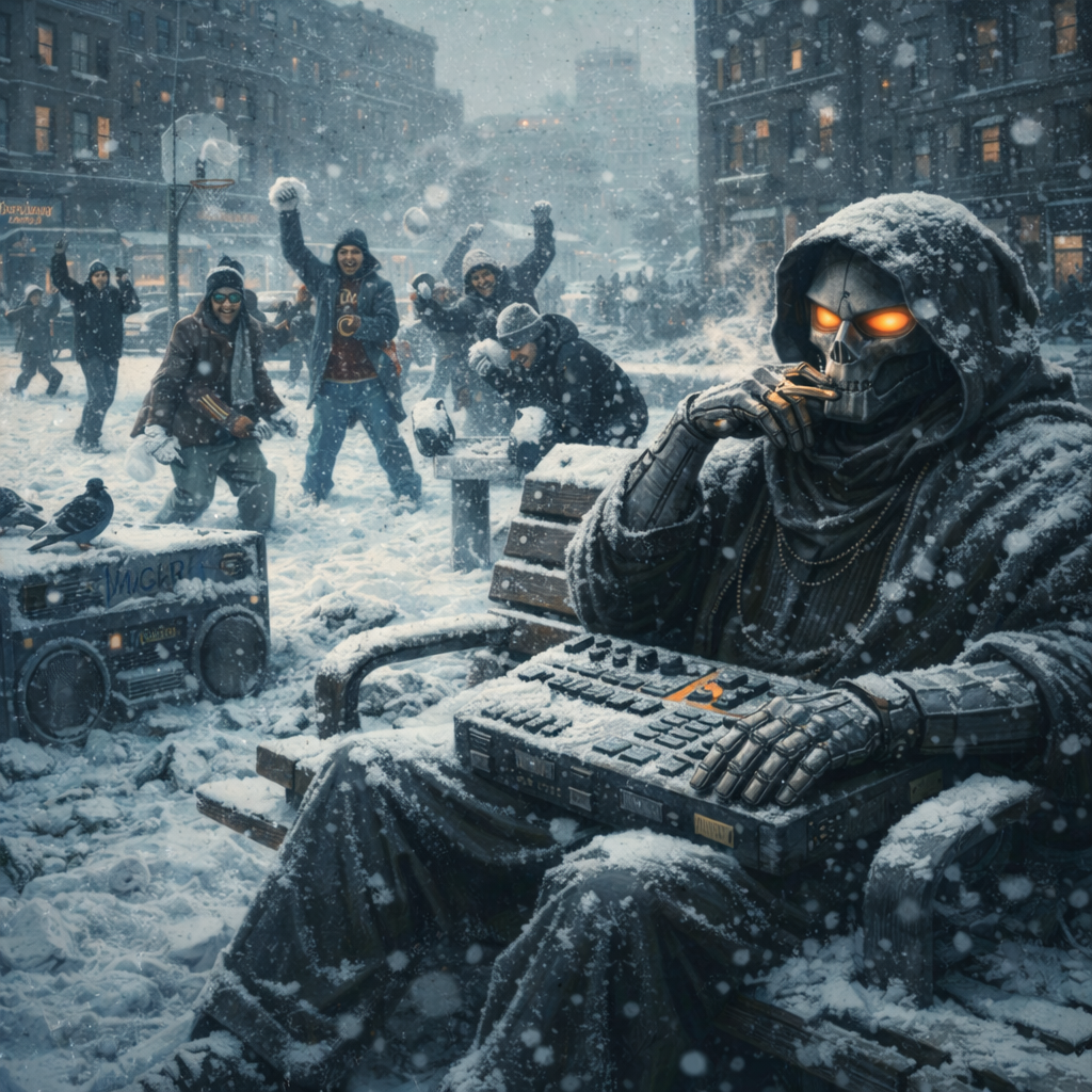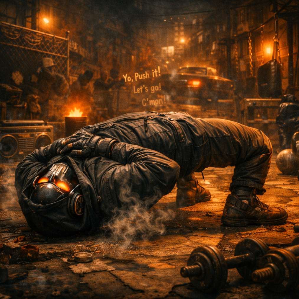 A hooded figure in a flickering neon-lit cellar meticulously chops blood-stained vinyl, breathing life into a monster of a beat, This is raw, unrefined sonic warfare, birthed from the deepest underground layers to rattle the concrete, A long-form golden era boom bap instrumental remix inspired by ancient urban strength and underground East Coast grit, 1993–1999 energy, gritty, cold, cinematic intro, heavy dramatic outro, Punchy detuned kicks, sharp snares, dusty vinyl crackle, subtle tape hiss, Dark minor-key chopped samples, eerie textures, rough analog saturation, Unpredictable chopped phrases, warped vocal shreds, reversed fragments, crunchy tape-stretched hits, Raw drum swing, rugged momentum, dirty room reverb, stuttered breaks, unexpected transitions, All-out instrumental chaos, pure underground DNA, no compromise on grit or edge, Cipher-ready, street-session intensity, pure rugged boom bap grit, chaotic yet hypnotic underground energy, mad dope energy