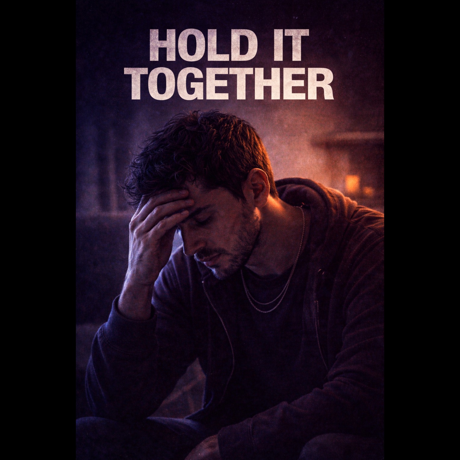 Groove-driven hip-hop soul with subtle rhythmic instability and emotional drop-out; intimate close-mic male vocal starting controlled and unraveling mid-song; warm bass and tight drum pocket in verse 1, minor-key Rhodes accents, restrained percussion; at mid-verse 2 production strips to sparse guitar and pad, drums drop out for emotional exposure; wide stereo image, clean vocal presence, tight low-end, softened highs; final chorus reintroduces drums gently but not full impact; ends fragile, unresolved, human, ‑heavy trap hats, ‑distortion, ‑cinematic strings, ‑choir layers