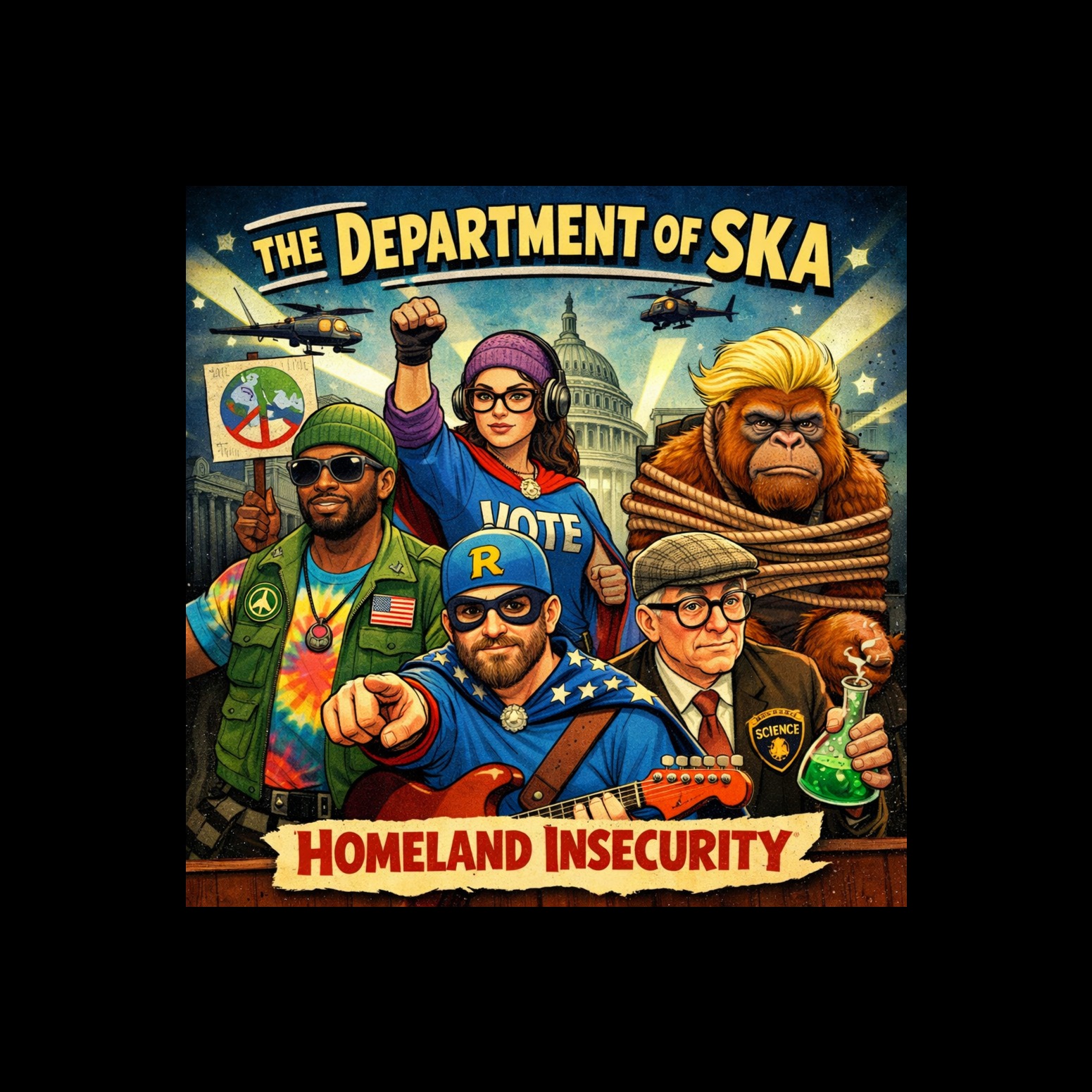 dark ska groove, minor key ska, spy ska, offbeat upstroke guitar, walking bassline, eerie ska organ, dramatic horn stabs, reggae ska rhythm, comic book villain energy, mid tempo 140 bpm, theatrical male vocal, gang chant chorus, mysterious cartoon soundtrack, playful but ominous mood