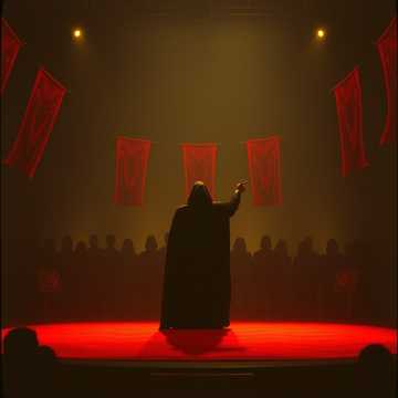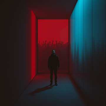 Dark stadium rock, electro-industrial elements, powerful male vocal, anthemic chorus, driving beat, distorted guitars, ominous synths, cult-leader vibe, building intensity, German lyrics, English lyrics