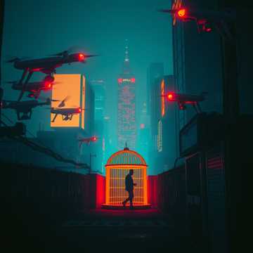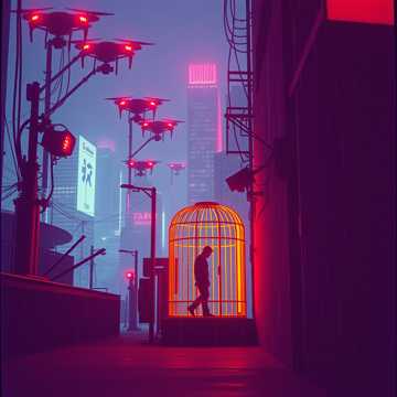 Synthwave cyberpunk, driving electronic beat, robotic vocal effects, futuristic synthesizers, dark atmosphere, sci-fi vibes, dystopian, mid-tempo