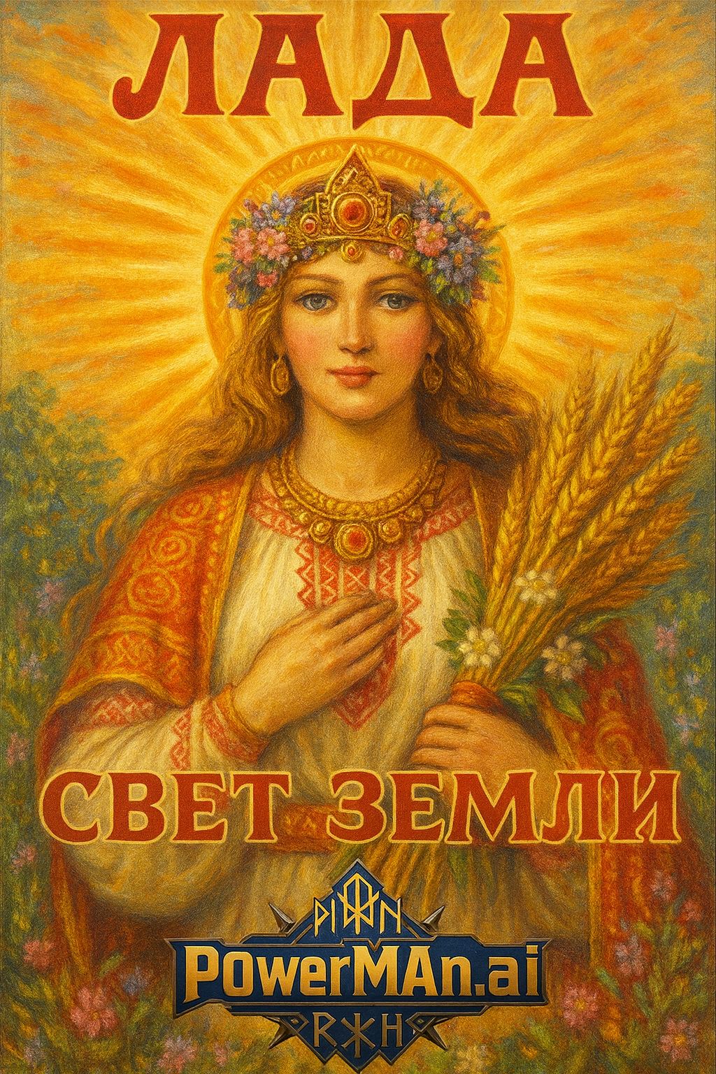 Lyrical Slavic ethno symphonic metal with female lead vocal and epic choir, Instruments: gusli, flute, orchestra, electric guitars, bass, drums, Mood: mystical, majestic, emotional, cinematic, Inspired by goddess Lada — spirit of spring, love, and light, Tempo: mid-paced, dynamic build-up (soft intro → epic chorus → calm outro), Use orchestral layers, ethnic percussion, choral harmonies, and atmospheric reverb, Duration: about 4 minutes