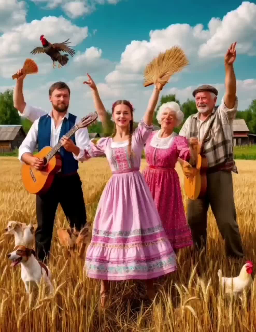 Slavic Folk, Modern Electro House, Hands Up, 128 BPM, 4/4 four-on-the-floor beat, authentic slavic female vocals, open throat singing, large folk choir, wide stereo field, heavy sawtooth synth, energetic balalaika riff, punchy bayan, loud kick, power claps, stereo delay, festive rave energy, authentic Russian language, sing in Russian