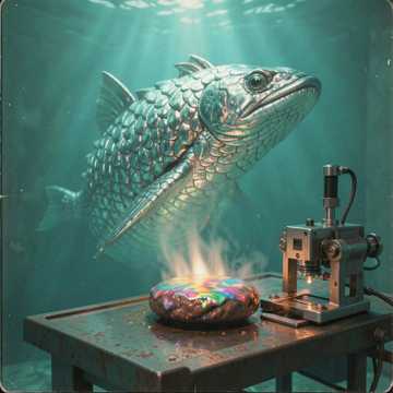 Grotesque Industrial Waltz, Metallic Grinding of Needles, Wet Flapping sounds of Coelacanth, Ancient deep-sea drone, 80s Cyberpunk OST, Clinical Rhythmic Beeps, High-Pitch Vocal Shrieks, Echoing Maniacal Laughter