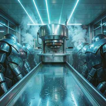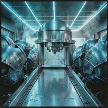 Grotesque Experimental Industrial, Heavy Metallic Clanging, Wet Scale Grinding, Deep Bass Sludge, 80s Cyberpunk Anime OST, Sinister Operatic Vocals, Mechanical Press Sounds, Echoing Maniacal Laughter