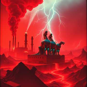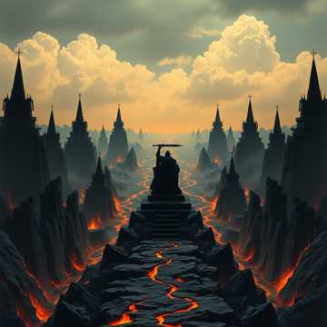 metal, heavy metal, thrash, epic choir, orchestral; a thunderous mix of blistering guitar riffs, relentless double bass drumming, guttural growls, and an ominous choir backed by a full orchestral arrangement, male vocals lead with raw aggression, supported by chants and operatic harmonies for an apocalyptic atmosphere