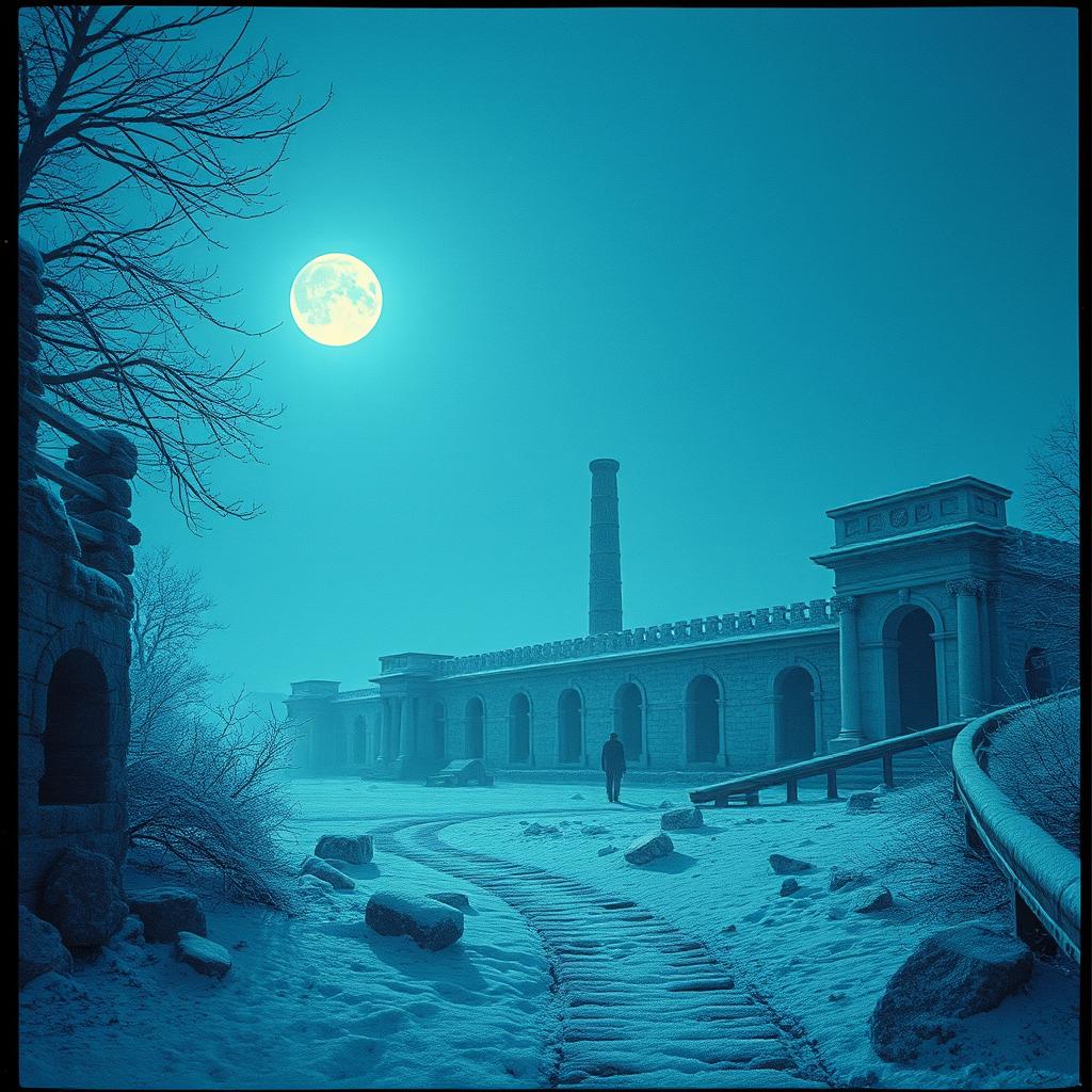 Dark, atmospheric Russian metal, 140 BPM, minor key, Drums evoke pounding horse hooves, Instrumentation: Powerful distorted bass; rhythmic drums with a mechanical snare; electric guitars forming a dense texture, not a melodic riff; a synth emulating a Vladimir horn folk melody, processed with distortion and echo, Vocals: Male baritone, shifting from clean to aggressive screams in the choruses, Structure: Verses with clean vocals over a pulsating bass; explosive choruses; an instrumental breakdown featuring a deep-reverb synth solo, Production: Dense, slightly compressed mix; upfront vocals; folk melody treated with delay and reverb