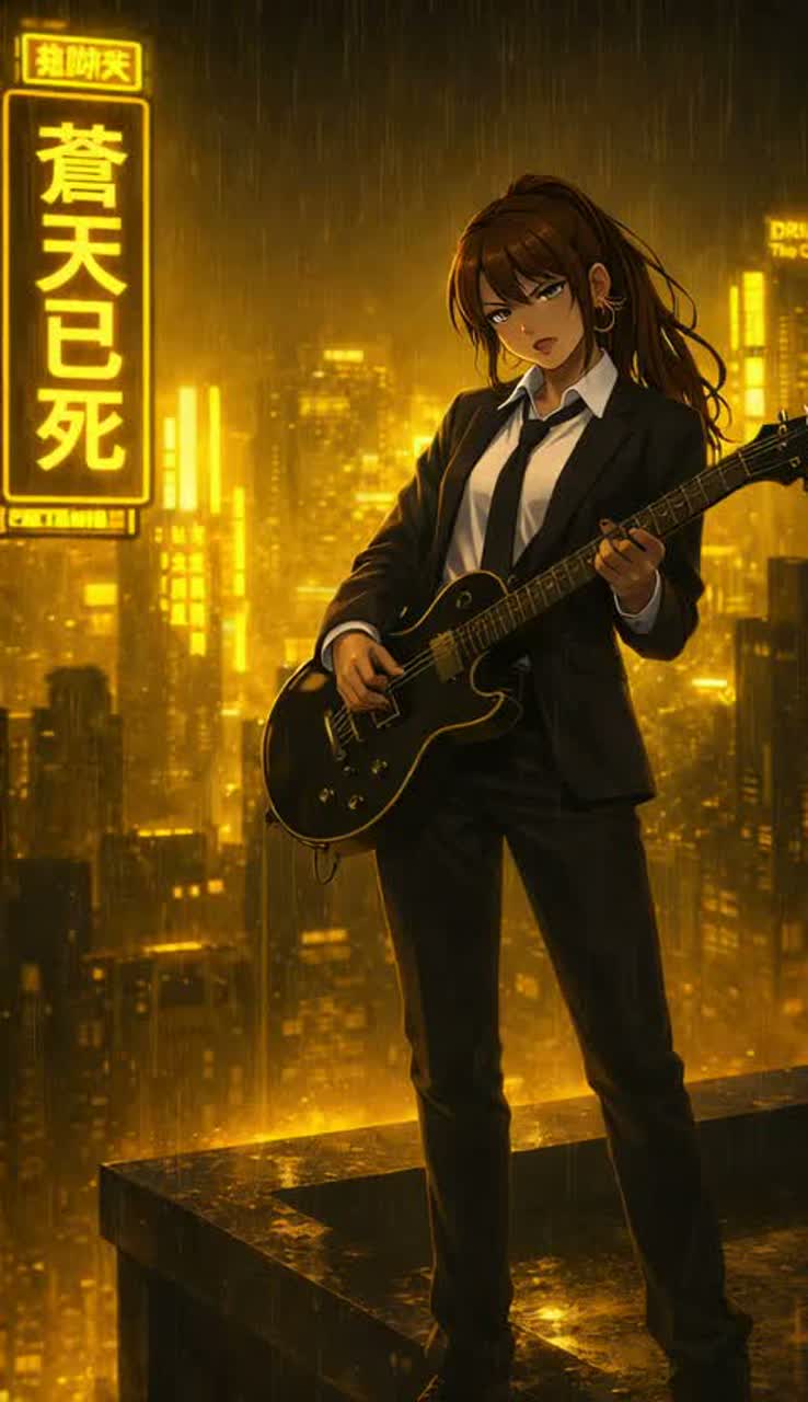 An emotional rock track driven by clean electric guitar, Female vocal singing throughout, with a slightly husky and melancholic tone, Soft guitar arpeggios with gentle reverb set a lonely nighttime mood, gradually building into a dramatic, more distorted guitar sound toward the climax, Lo-fi inspired drums with a subtle kick and snare, Light electronic pads and minimal strings float in the background, The sound expresses exhaustion, quiet rebellion, and the dim glow of hope in a worn-out city, Strong contrast between calm verses and emotional, expansive choruses, A dark, atmospheric guitar-focused emotional rock track