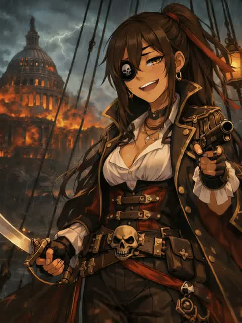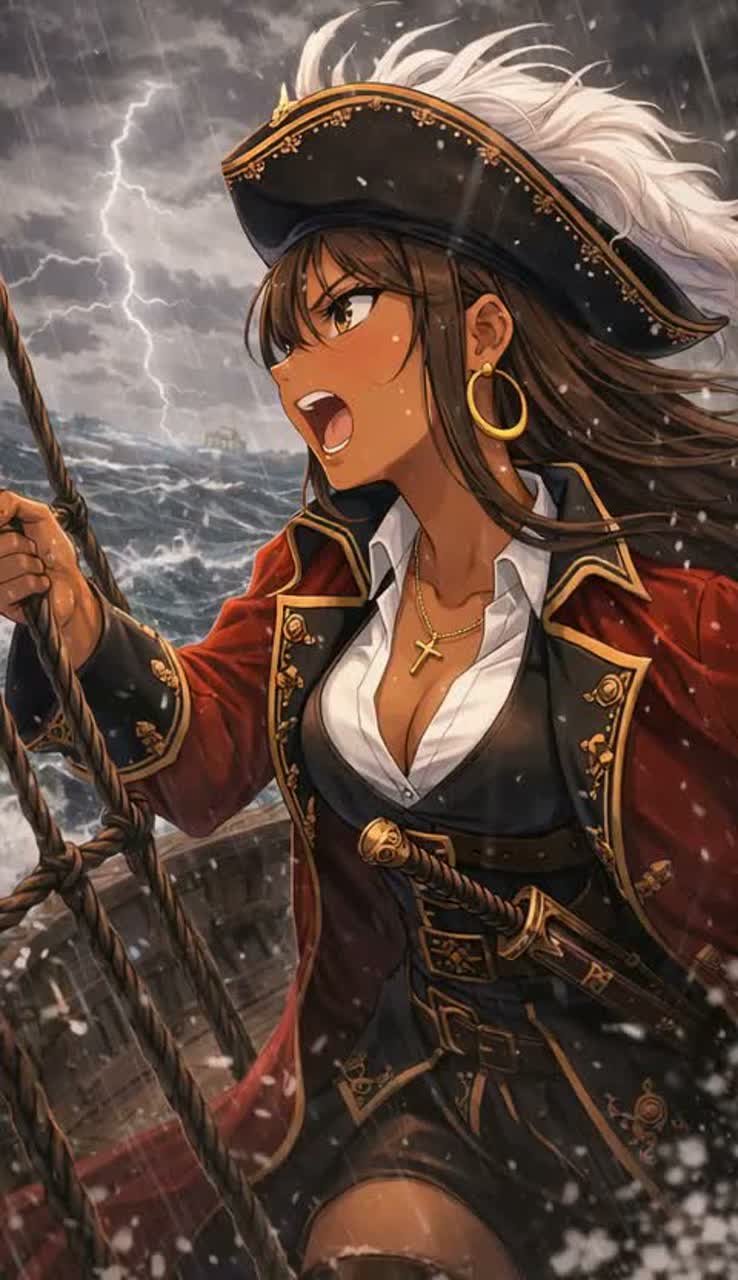 Dark trap track with a pirate-inspired atmosphere, mid-tempo and head-nodding groove, Deep sub-bass and minor-key samples create a shadowy nautical mood, like drifting across a stormy sea at night, Subtle vinyl crackle, low strings, and dark textures add grit and depth without feeling overly modern or glossy, **Verse (Japanese Female Rap):**