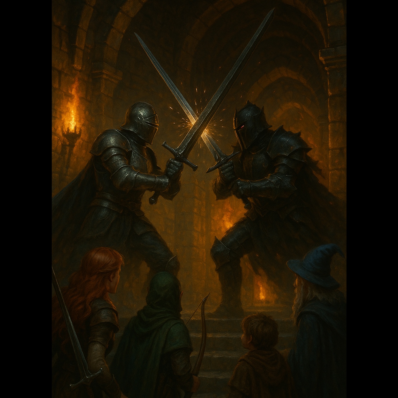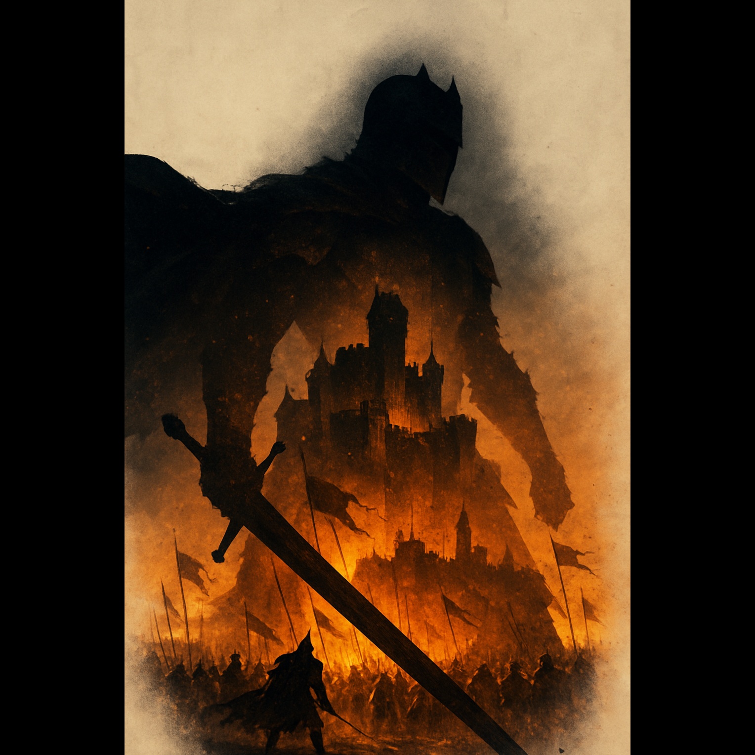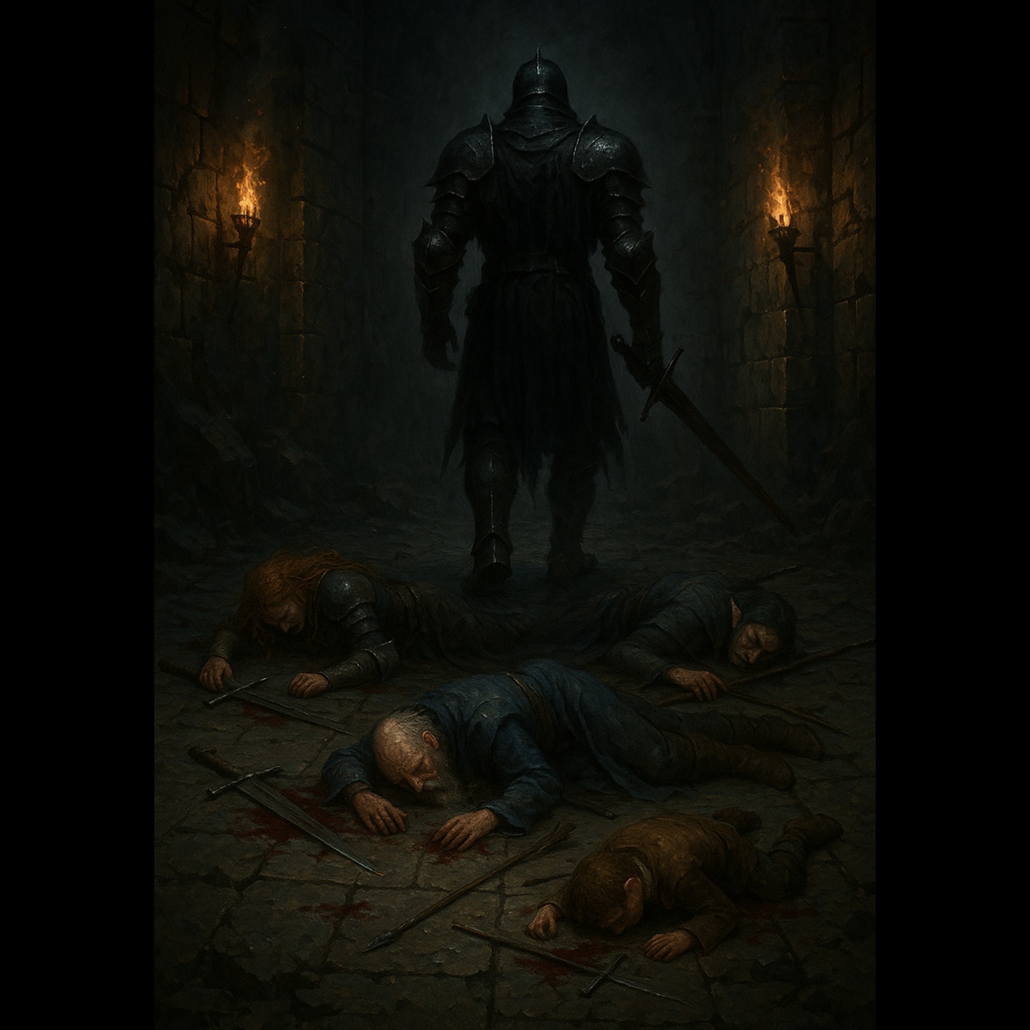 dark medieval battle chant with fast war drums and frame drums, hurdy-gurdy and zanfona rhythm, aggressive salterio and lute textures, metallic clashes, fire ambience, deep male voice with calm and menacing tone, slightly echoing, like a cursed knight speaking from beyond death, no growling, no rasp, voice sounds ancient and controlled, clear and rhythmic chanting, intense RPG boss fight energy, ‑rock, ‑pop, ‑metal