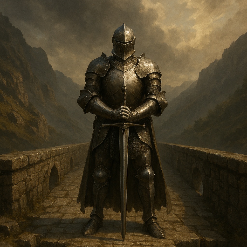 Powerful and ancient-sounding medieval theme with rebec, zanfona, laúd and solemn horns, slow and noble rhythm, evokes a trial of honor and purity before a mighty knight guarding a bridge, grand and sacred atmosphere