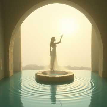 Ethereal sacred ballad with reverent female vocals, slow 4/4 that breathes like a tide, Harp arpeggios carry the harmony, soft chimes marking key phrases, and wide ambient pads forming a glowing halo behind the voice, Intimate first verse with close-mic whispery tone; chorus blooms with layered harmonies and long, echoing tails, Reverb is deep and wet, creating the sense of a vast stone chamber lit by moonlight; dynamics stay restrained but quietly immense, like a ritual that’s been spoken for centuries, soft, slow, ambient, harp, female vocals