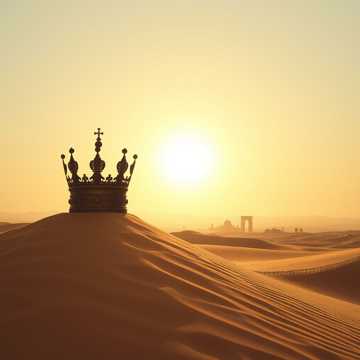 Regal dark fantasy score with low male and mixed choir, Deep cellos and basses pulse in slow, deliberate steps; sparse toms and frame drums mark a measured procession, Distant war horns and subtle brass swells rise like dunes in the heat, Vocals chant in calm, ritual patterns—disciplined, unwavering, Reverb-drenched halls, stone and sand, authority that builds without ever breaking into frenzy, slow, deep, low