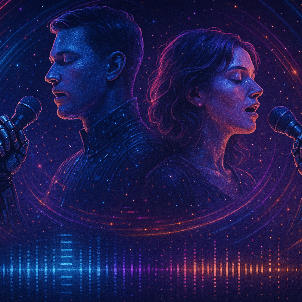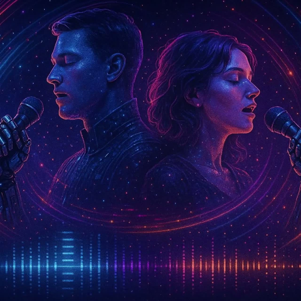 robotic backround vocals, mechanical reverb, Dirty sub-bass groove, cello, deep 808 Bass, crisp off-beat synth plucks instead of guitar, tight snare and rimshot combo, syncopated kick pattern, metallic percussion hits, airy vocal chops, cosmic pad textures, deep reverb space, A duet between a male and a female singer, They sing in turns, and join together in the chorus, vocoder voice harmonies, robotic yet emotional