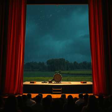 Thai Luk Thung slow sweet ballad, classic traditional style inspired by Kung Sutthirach Wongthewan, male vocal with clear central Thai accent, emotional heartfelt singing with Likay-style drama, nostalgic and romantic sadness, slow tempo, expressive intro and outro, accordion as main melodic lead blended with traditional Thai instruments, featuring Thai xylophone (ranat) phrases that answer the vocal lines, soft Thai percussion and warm string textures, rural nighttime atmosphere, poetic storytelling about a Likay performer lost after love fades when the show ends, classic luk thung structure with intro, verses, hook, bridge, and outro, vintage Thai luk thung feeling, sweet yet deeply sorrowful, cinematic and traditional Thai mood, suitable for emotional listening and storytelling performance, ‑กุ้ง สุทธิราช วงศ์เทวัญ