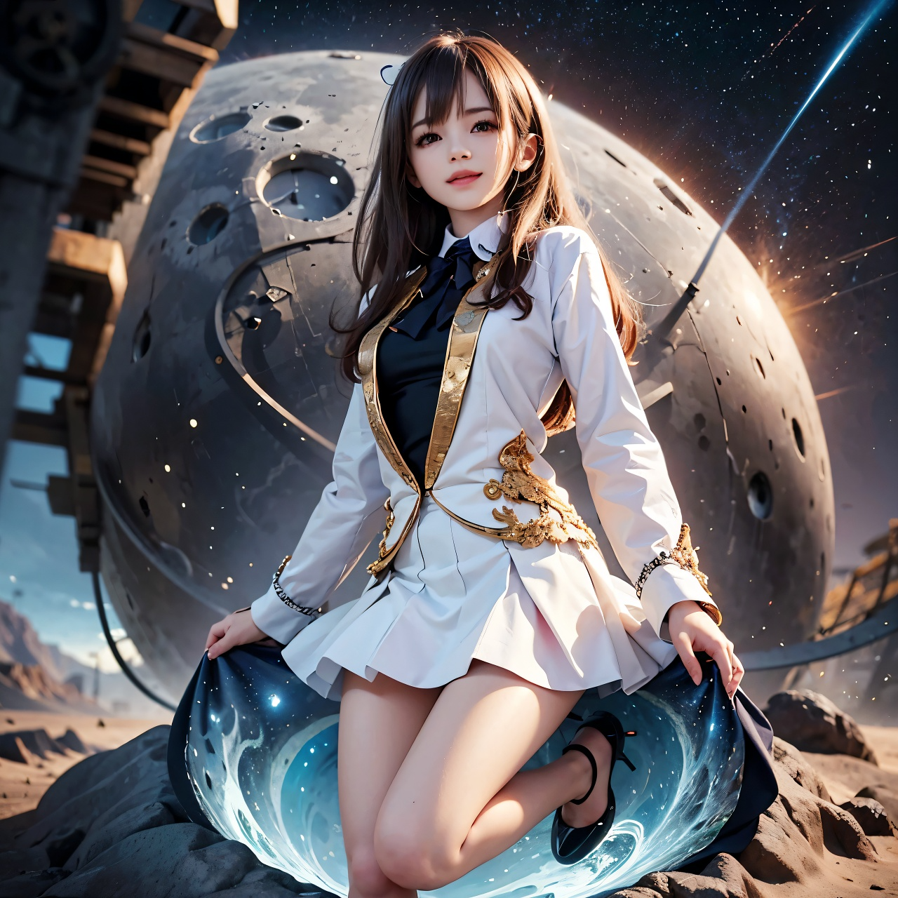 Anthemic EDM × Cinematic Opera × Uplifting Trance, Operatic soft female vocals, pulsing synth arpeggios, sparkling melodies, BPM:132, futuristic dance rhythm, wide stereo field, crisp percussive layers, ascending chord progressions, uplifting energy, moonlight and solar-inspired theme, robotic vocal FX accents, clean mix, layered textures, sidechained pads, catchy drop, vibrant trance-pop fusion, joyful